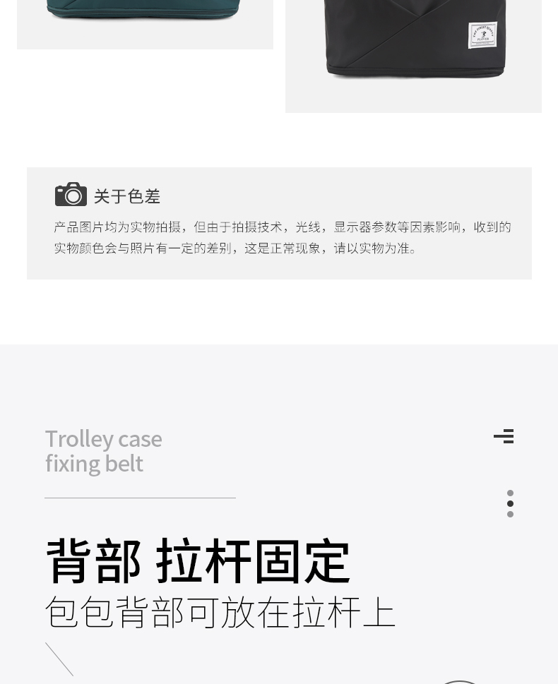 用创新设计,高品质材质与精湛工艺三大优势,以别致匠心,融合贴心设计。牛津布面料,耐磨防泼水,内外拉链暗袋,拓展加高13cm,大容量不可小觑。包袋顺滑拉链开合,大开口取物便捷。舒适手提柄,人体工程学设计,提久不勒手。可套拉杆箱使用,出行不用拎包更省力。可随意切换不同场合。是一款超棒的旅行神器!