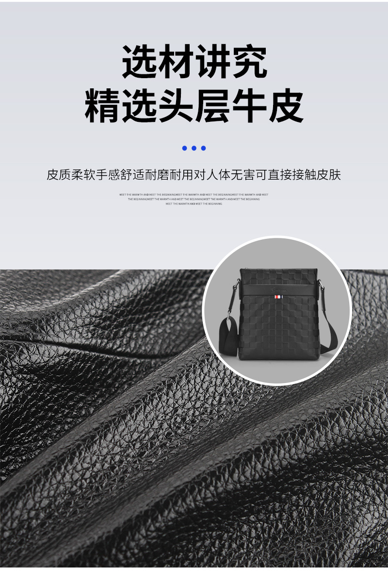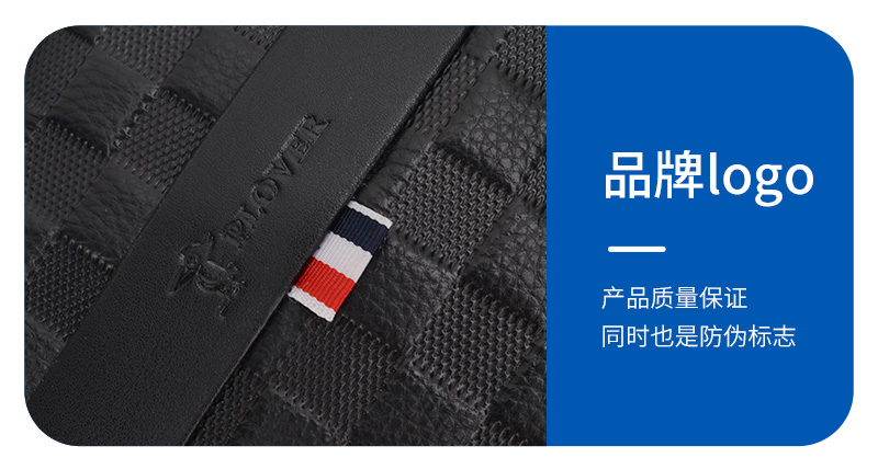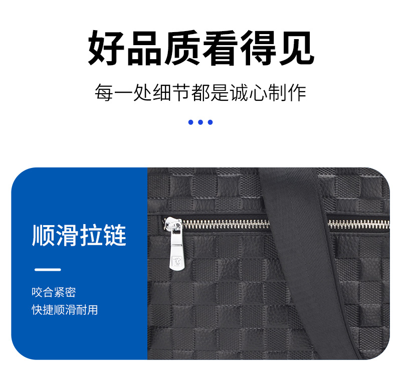 本产品采用特优级头层牛皮制作,方格纹理,面料经久耐用,搭配靓丽五金配饰凸显产品的高贵气质,背面五金拉链袋设计方便物品取放。