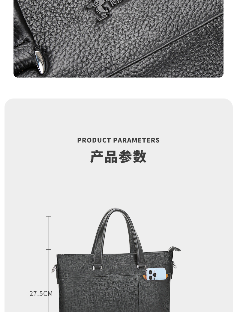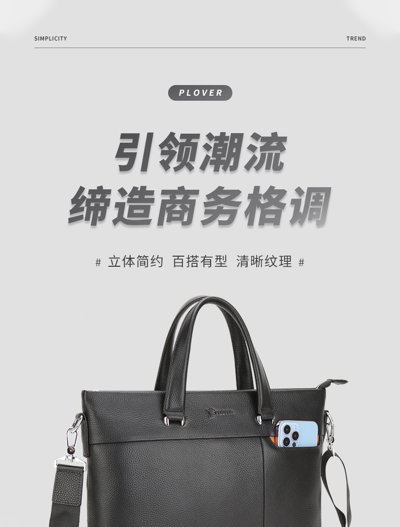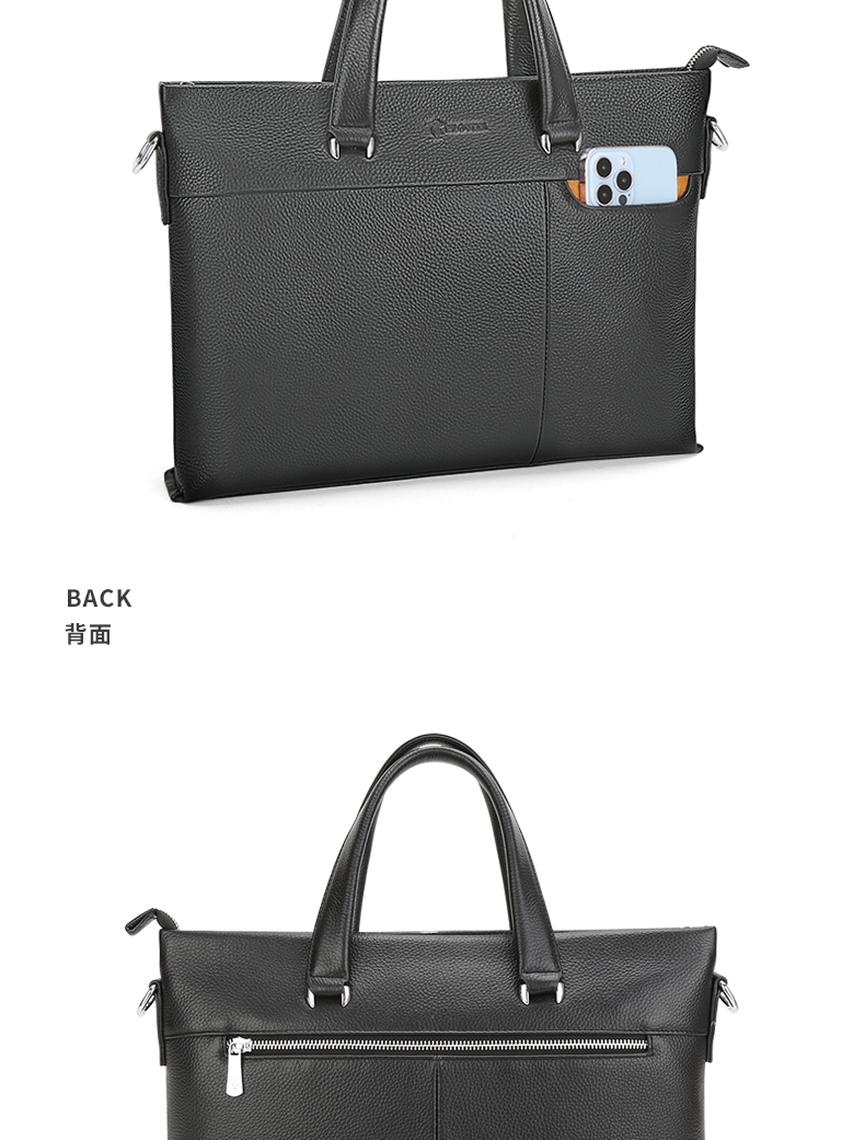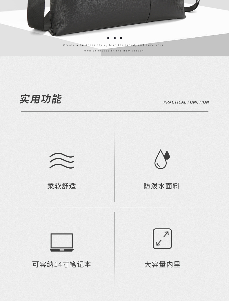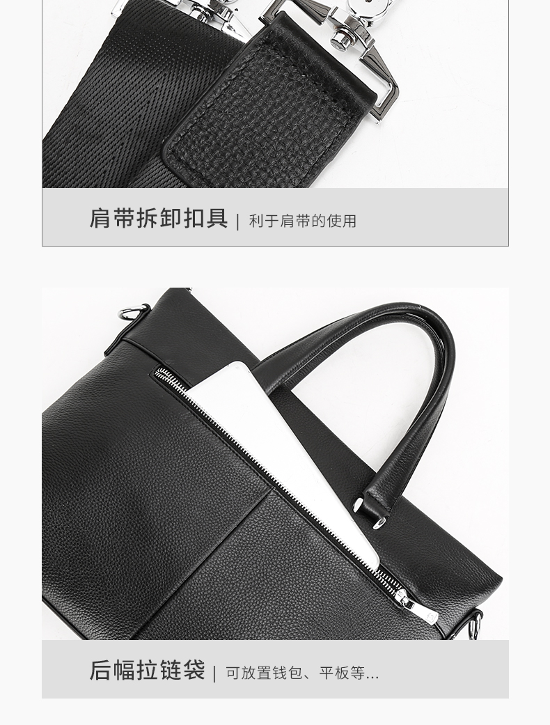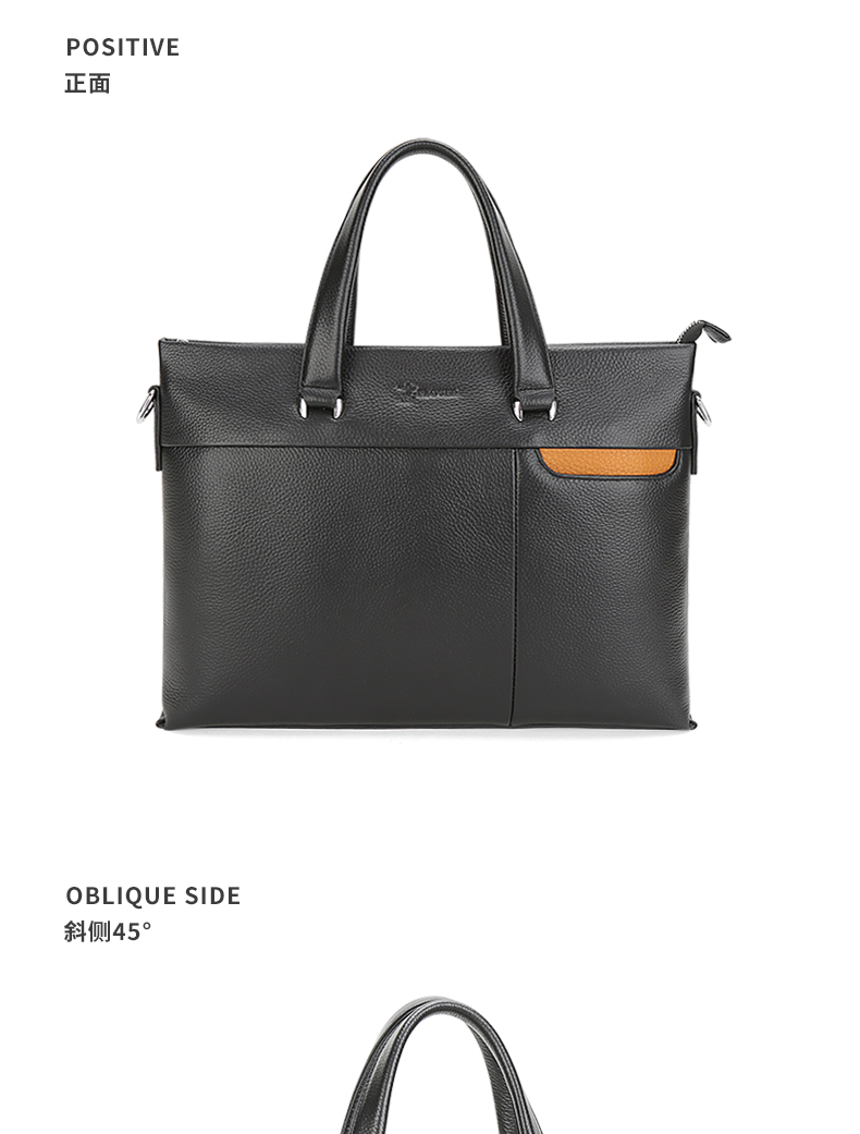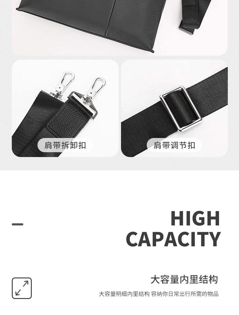 选用舒适柔软的头层牛皮,纹路清新自然,前右上搭配手机袋,内侧设计有电脑卡位,方便用户将洽谈业务所需要用到的电脑位置。可拆卸可调节抗压负重形肩带,美观牢固适合!
