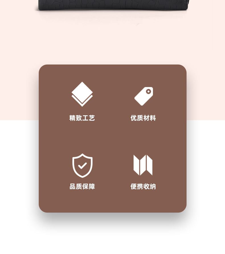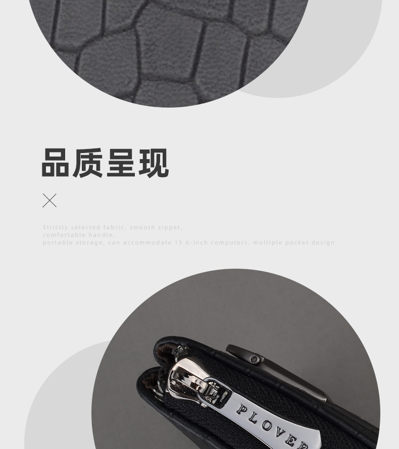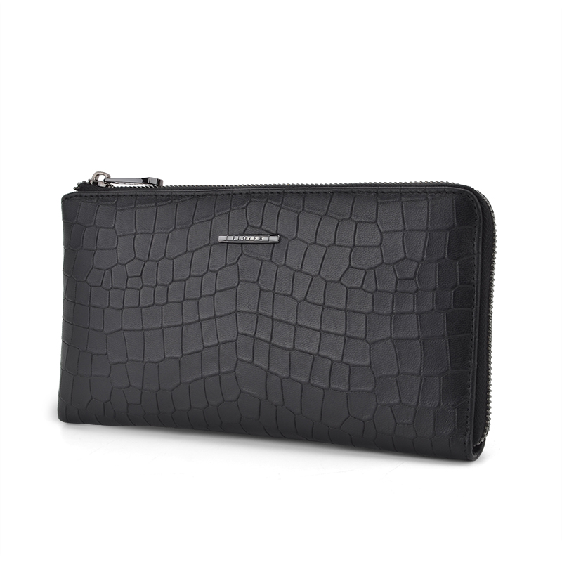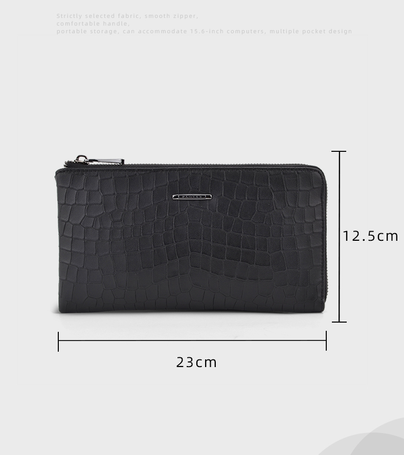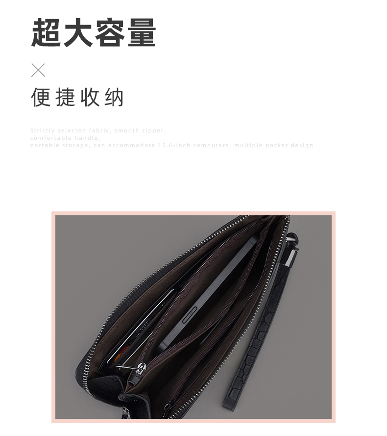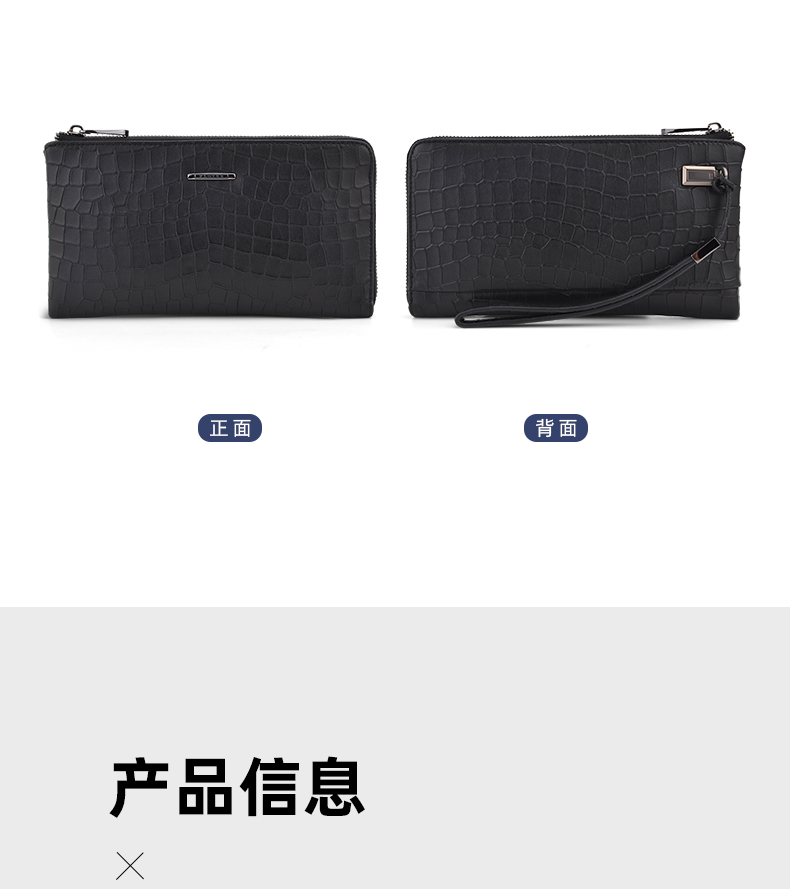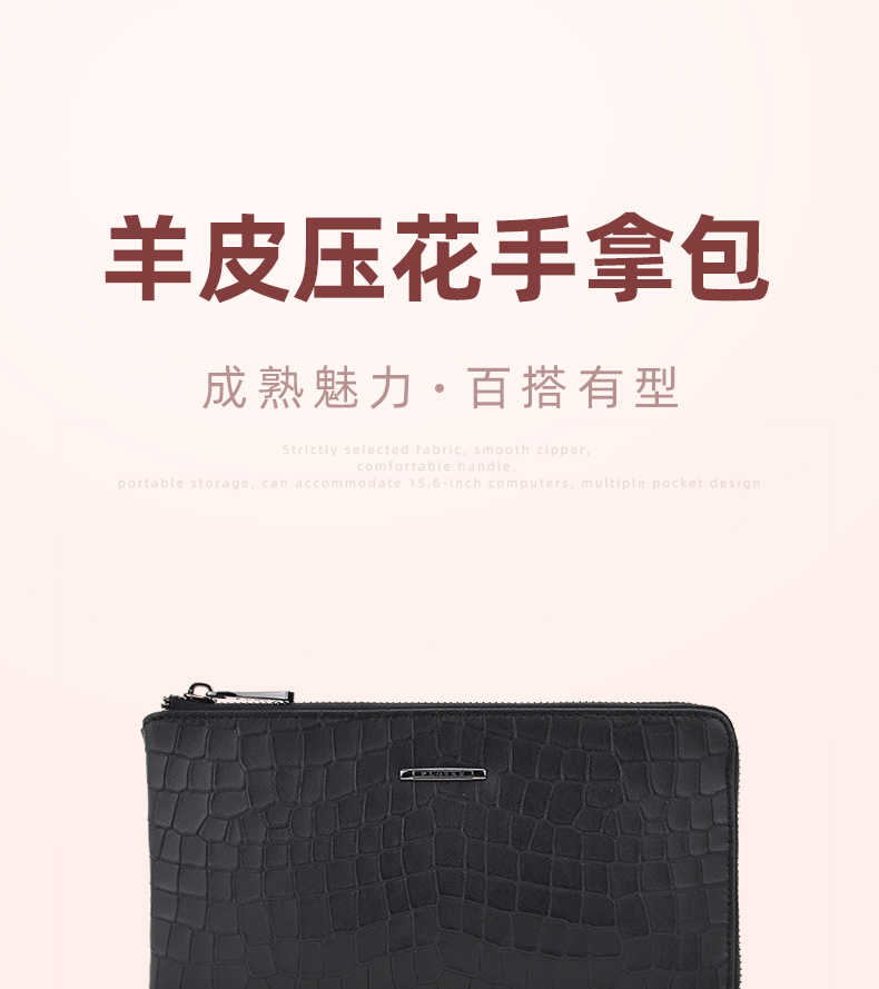 采用羊皮压花,手感柔软,真空电镀五金持久耐用,人性化可拆卸手腕带,内前后幅袋方便常用物品取放,部多个卡位设计,拉链暗袋