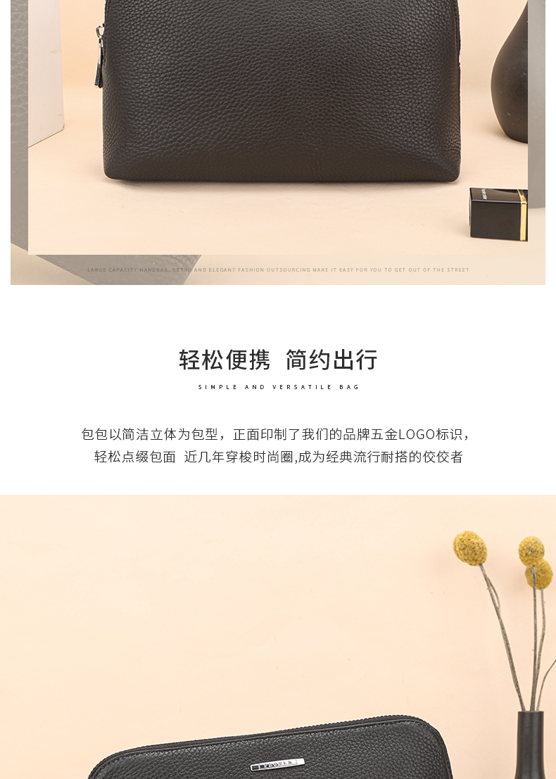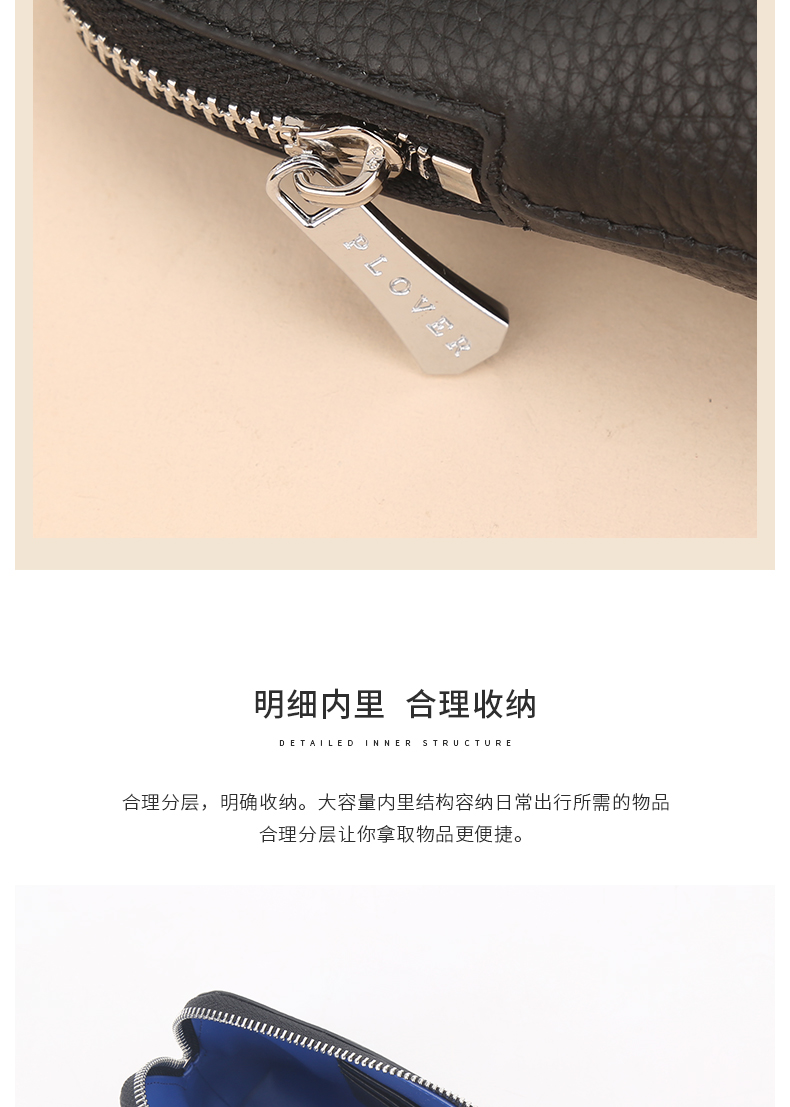 手包面料精选纹理清晰细腻柔软的头层牛皮,优质的五金配件顺滑的拉链来回自如!内格撞天蓝色超纤,耐用,内设3卡位.简于优雅!