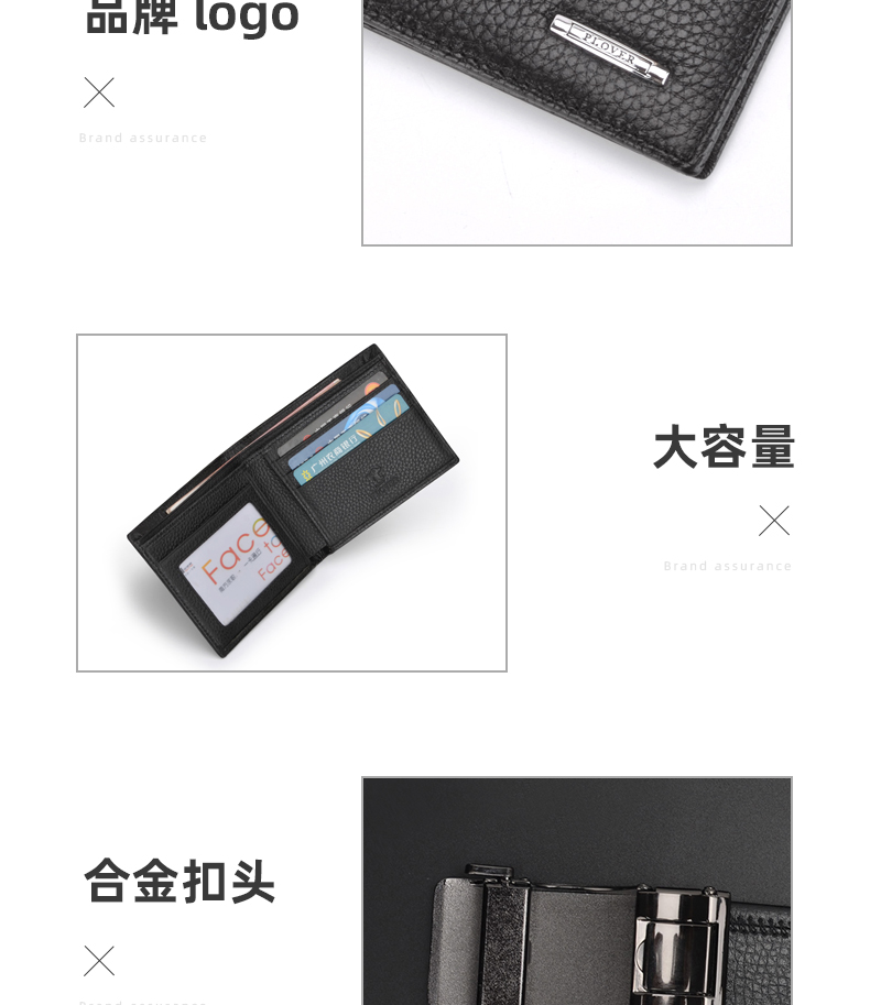 钱包采用头层牛皮制作,手感细腻,大面装品牌LOGO金属,带身采用PVC耐磨料,带身压印品牌LOGO,工艺采用内车线工艺,扣头采用锌合金真空电镀,亚克力磨砂片贴片,弹簧自动装置,实用更便捷