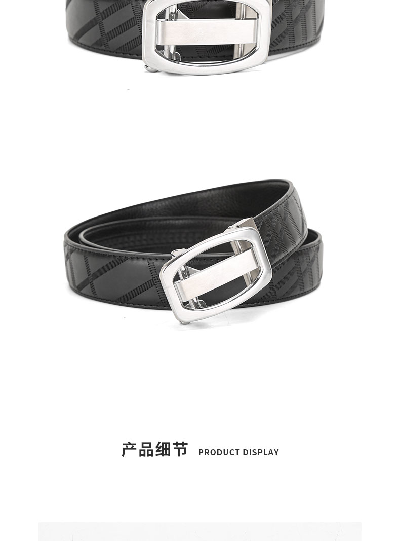 皮带采用耐磨PU革、不易断裂、压花工艺,条纹清晰,内部采用高强度防变形夹心,休闲时尚,搭配中间镂空椭圆扣头,高端大方