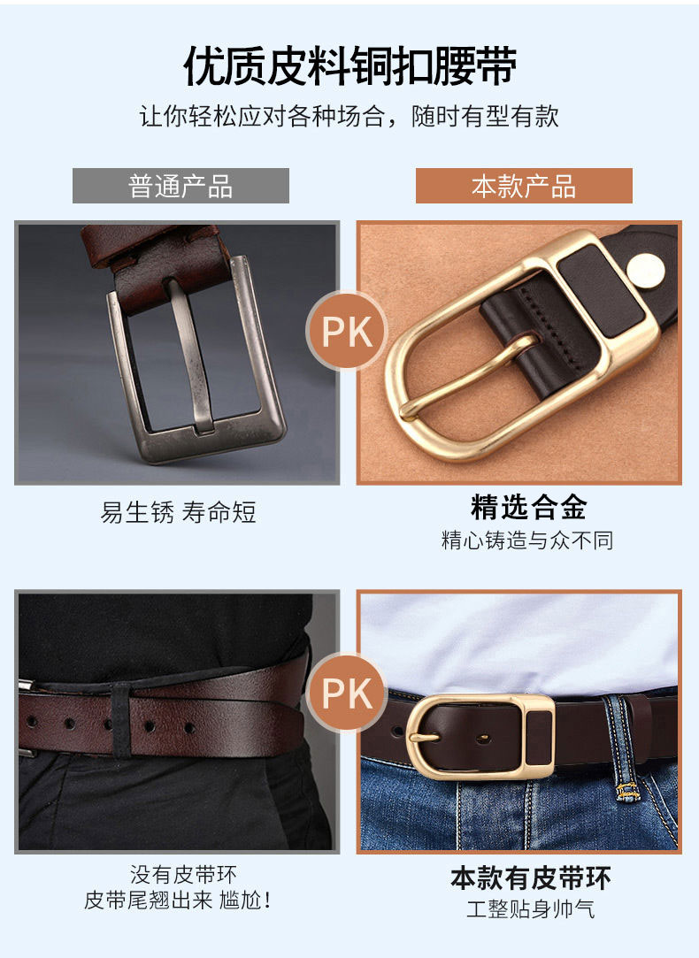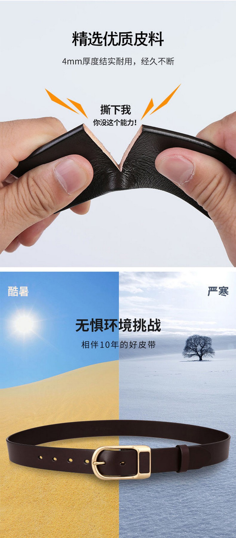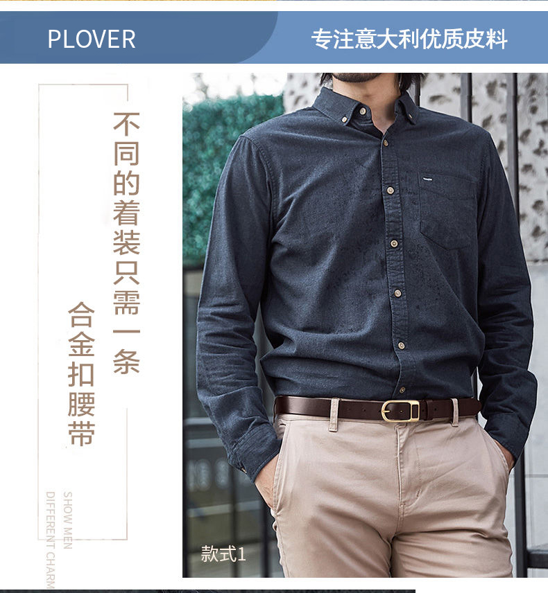 时尚简约款,带子采用质感牛皮,底面选择撞色搭配/黑配啡.扣头采用锌合金真空电镀工艺,休闲质感,有型有款,佩戴在腰间瞬间有一种温文尔雅的气质。 颜值与实用性并存的皮带值得大家选购。一般有孔的是针扣形式,可以根据穿着自由搭配。在休闲风格之下,皮带有了更多的随意别法,常常会有意想不到的效果。
