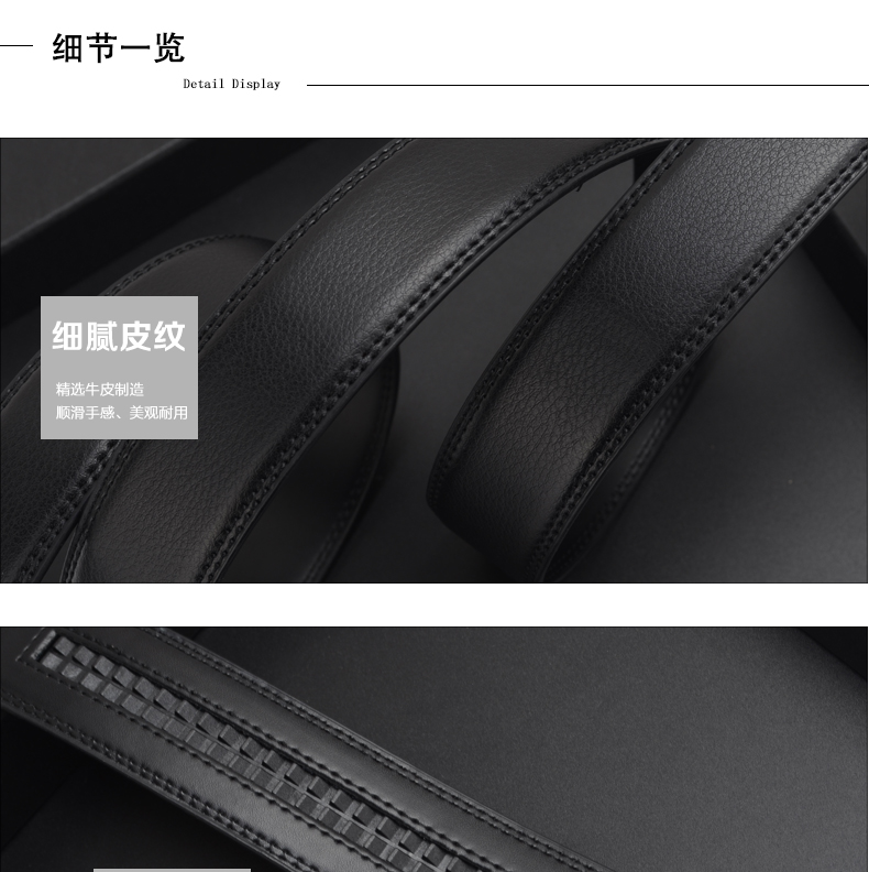 锌合金五金扣头,真空电镀工艺靓丽如镜面,激光雕刻纹理+贴标品牌LOGO,带身采用二层牛皮,耐变形夹层保证皮带在使用中不易变形,封边采用车线+油边工艺,带身尾部采用热压印LOGO工艺