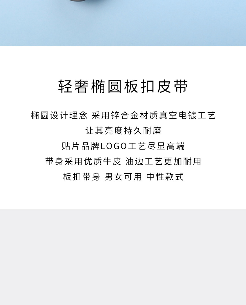 产品设计新颖,椭圆设计理念,采用锌合金材质真空电镀工艺让其亮度持久耐磨,贴片品牌LOGO工艺尽显高端,带身采用优质牛皮,油边工艺更加耐用,板扣带身,男女可用,中性款式。