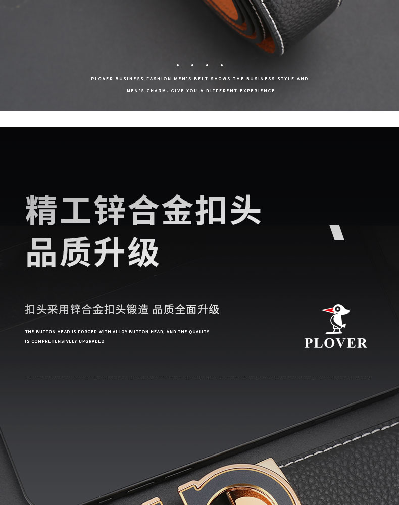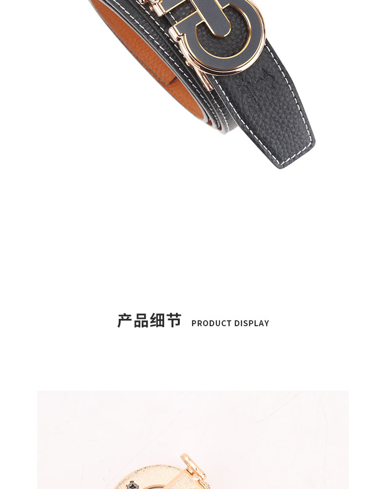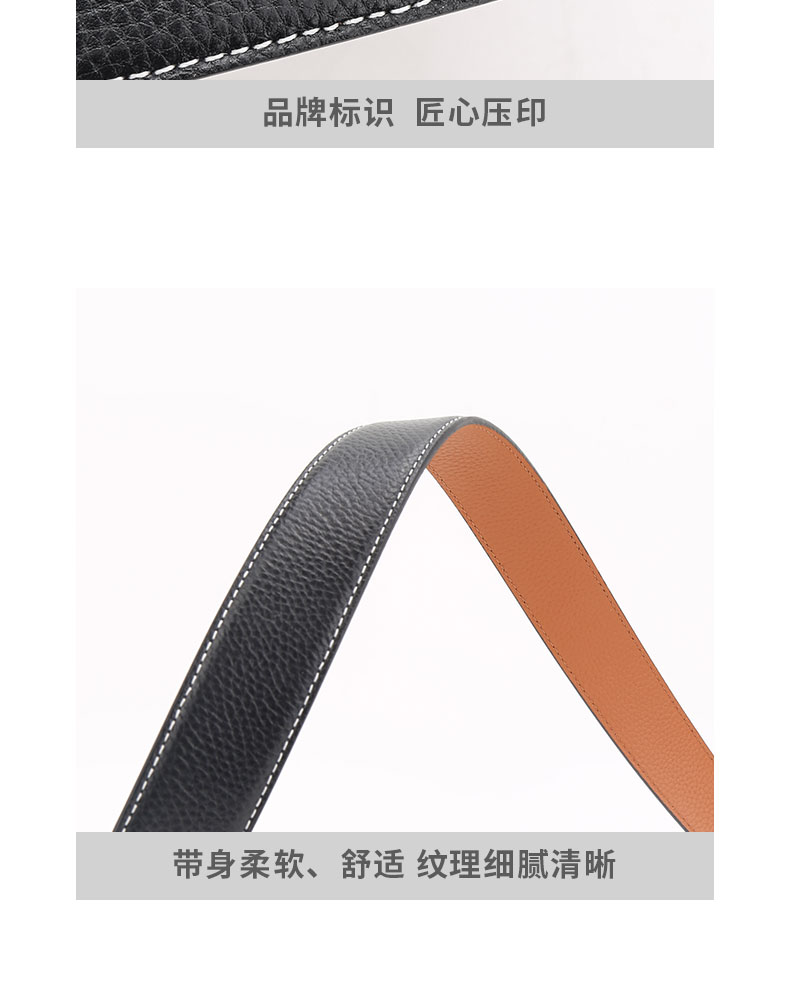 扣头采用锌合金真空电镀工艺,双D设计,新颖,带身精选最优质的头层牛皮,纹理精致细腻!外观细密柔软。走线工整,无缝连接,构想更增添立体感。