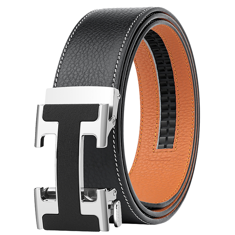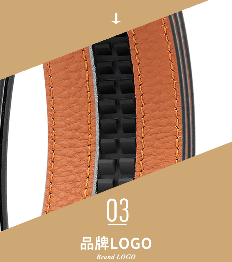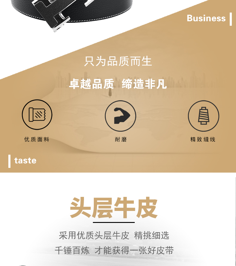 锌合金五金扣头,真空电镀工艺靓丽如镜面,激光雕刻纹理+贴标品牌LOGO,带身采用头层牛皮,耐变形夹层保证皮带在使用中不易变形,封边采用车线+油边工艺,带身尾部采用热压印LOGO工艺