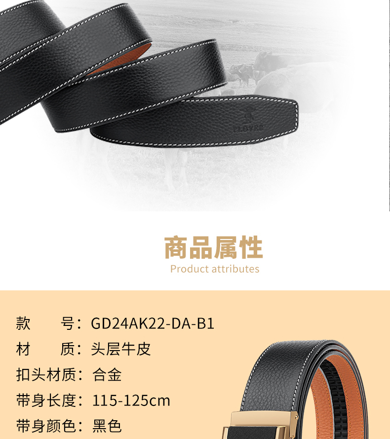 锌合金五金扣头,真空电镀工艺靓丽如镜面,激光雕刻纹理+贴标品牌LOGO,带身采用头层牛皮,耐变形夹层保证皮带在使用中不易变形,封边采用车线+油边工艺,带身尾部采用热压印LOGO工艺