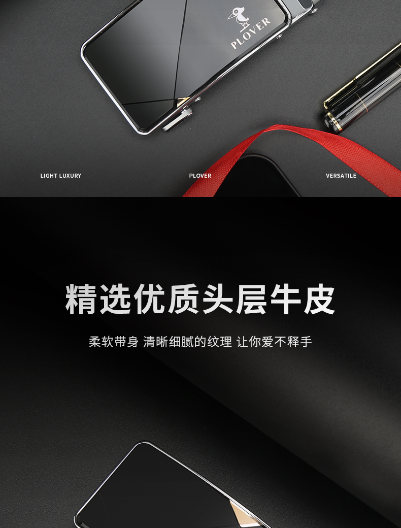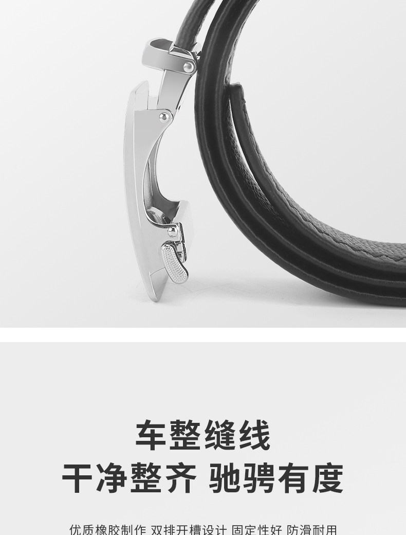 本品采用金属质感好、抗氧化、坚固耐用、不易断裂、经典耐看的络色高端合金材质扣头,电镀时尚浅金色品牌标志、手感细腻,质感舒适、荔枝纹路清晰的牛皮带身配套搭配,美观协调,尾部还有压印品牌logo,更显高端,精美礼盒包装。