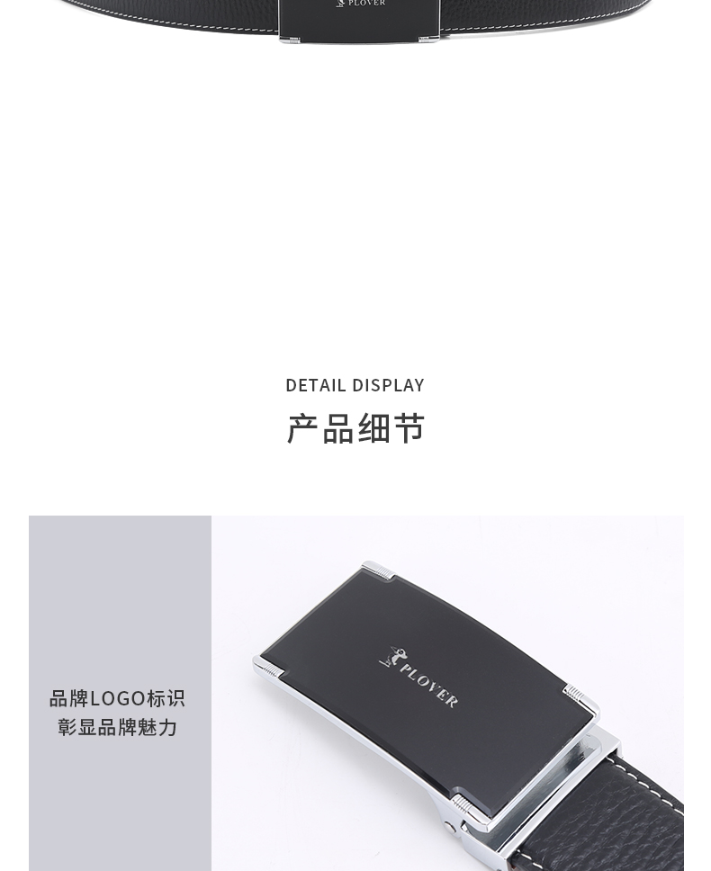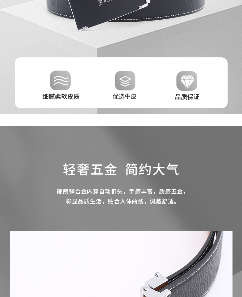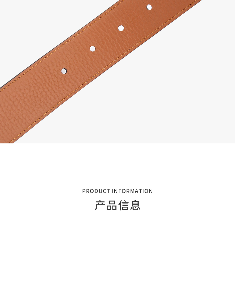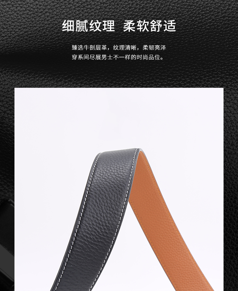 带身采用头层牛皮,带身压印品牌LOGO,工艺采用油边+车线工艺,扣头采用锌合金真空电镀,亚克力磨砂片贴片,板扣扣头无卡顿实用更便捷