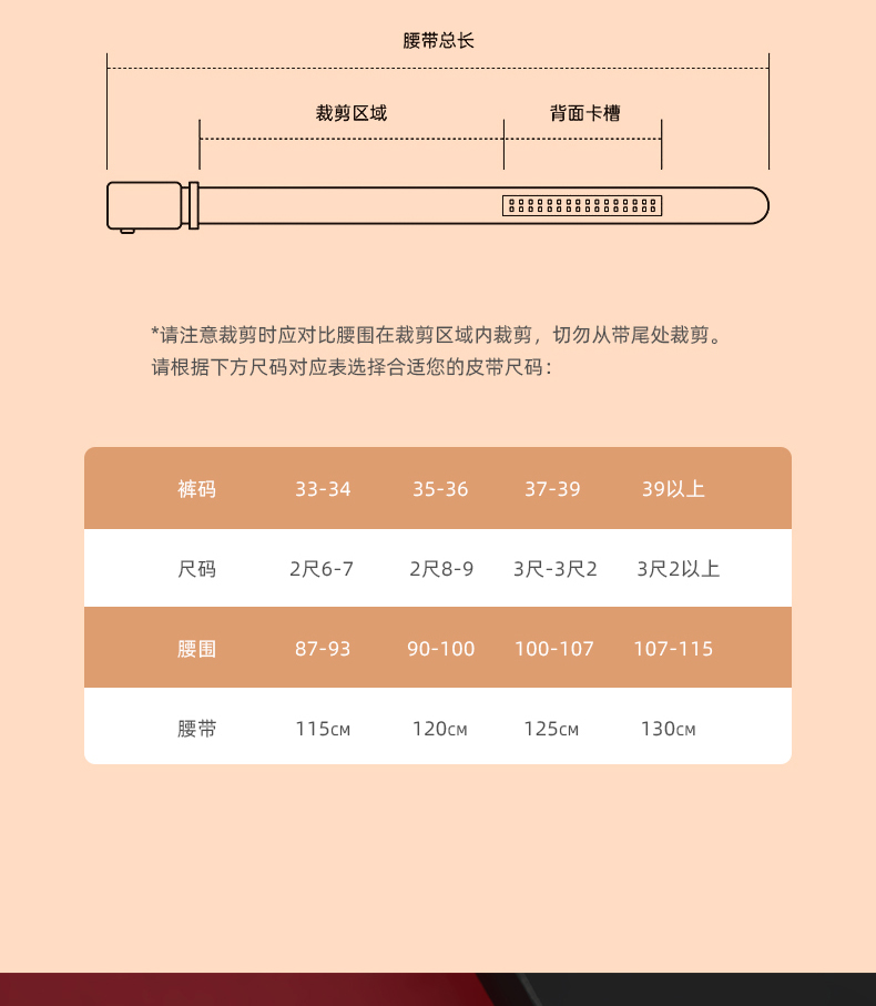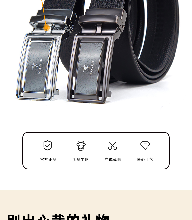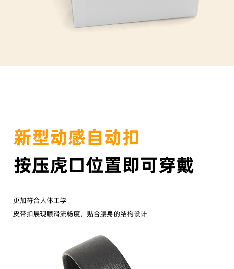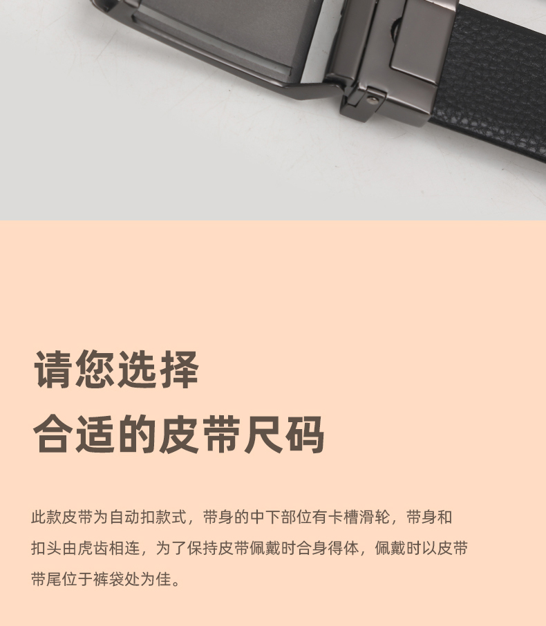 选用优质头层牛皮, 皮质细腻手感舒适,经久耐用,带身商务时尚做法,无缝、无线做法,搭配新款动感合金扣头,一按轻松解开皮带,无需开关,时尚大气,提升档次和形象。