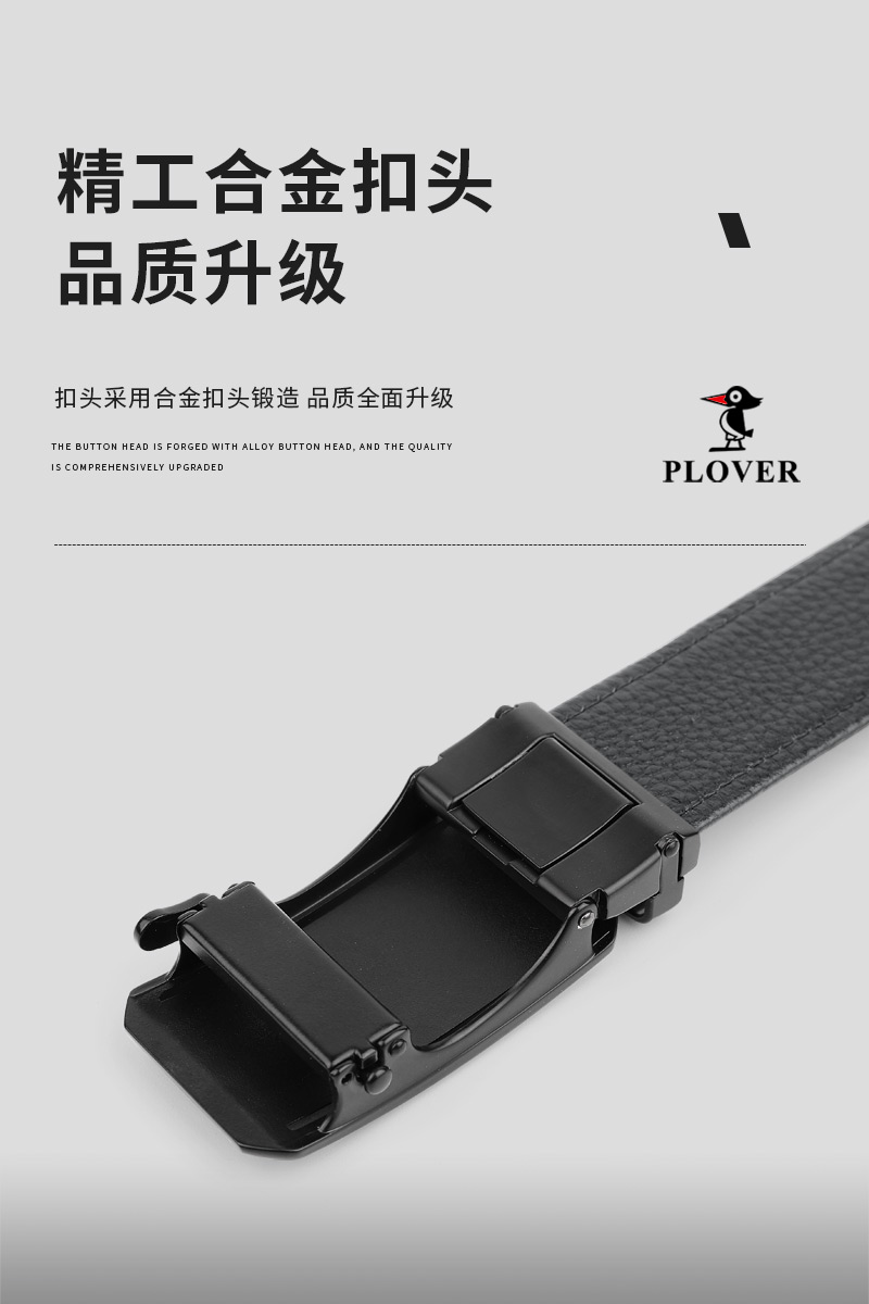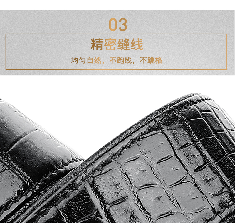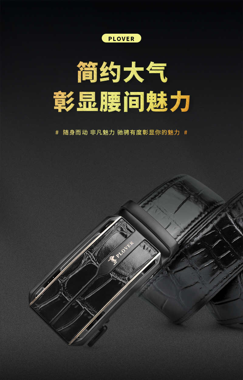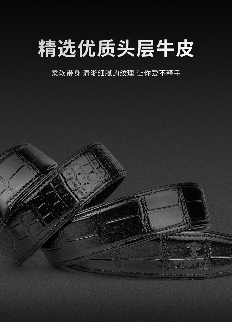 本产品设计新颖,带身面材质采用彰显气质的鳄鱼纹头层皮,底材质采用纹路清晰分明的荔枝纹头层皮.高端合金扣头面贴鳄鱼纹头层皮,与带身鳄鱼纹皮配套搭配,美观协调.扣头面金色激光品牌LOGO,更显高端,此带身手感舒适,大气美观,尾部还有压印品牌LOGO.高档包边车线做法,永无后顾之忧