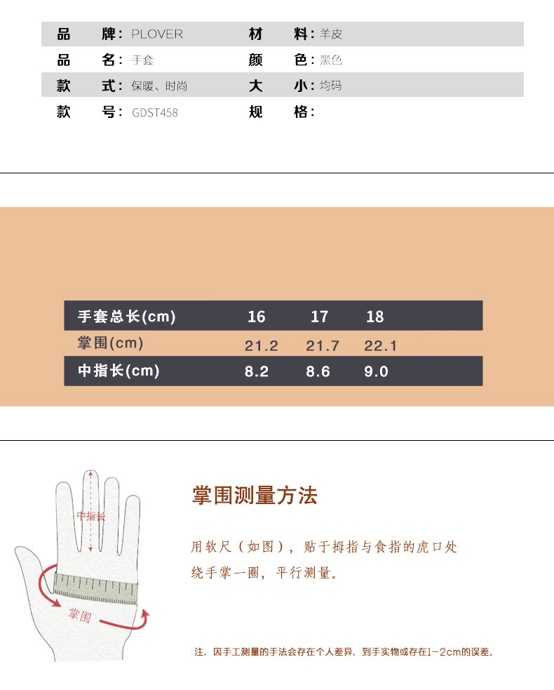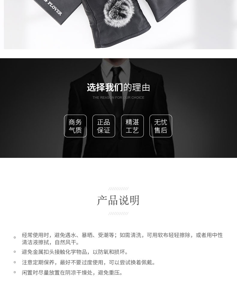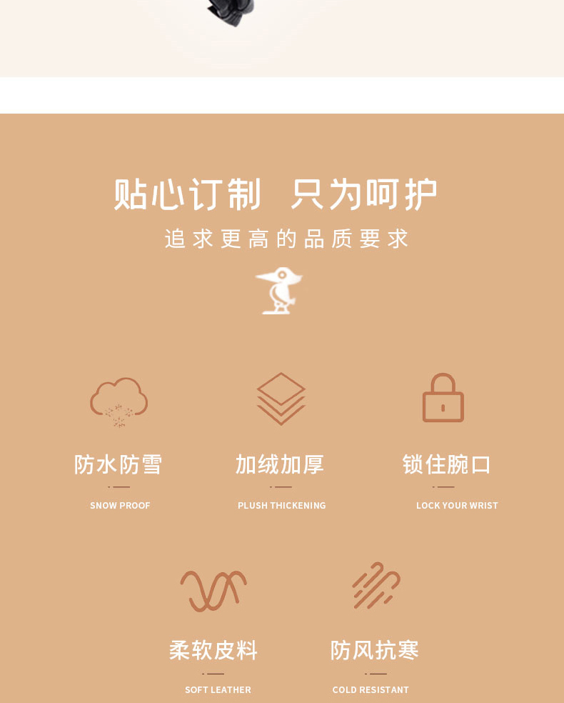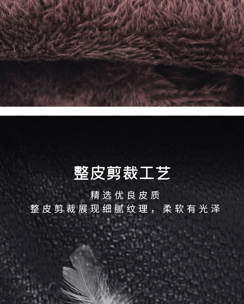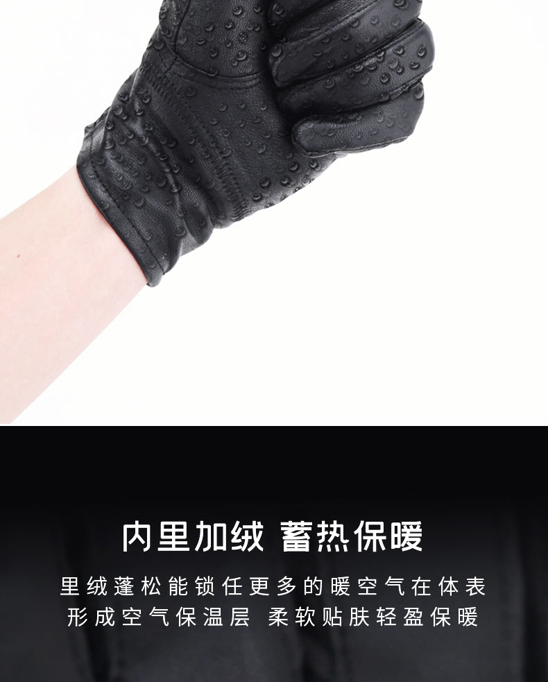 手套的面料选用优质柔软的羊皮,触感柔软顺滑。加绒密度更强更细密,有效抵挡寒风,保暖更胜一筹。款式新颖,做工精美,贴合手部的剪裁,这样会显得手指纤长,不臃肿。没过多的装饰,简约大方,自带高贵感!---不可触屏