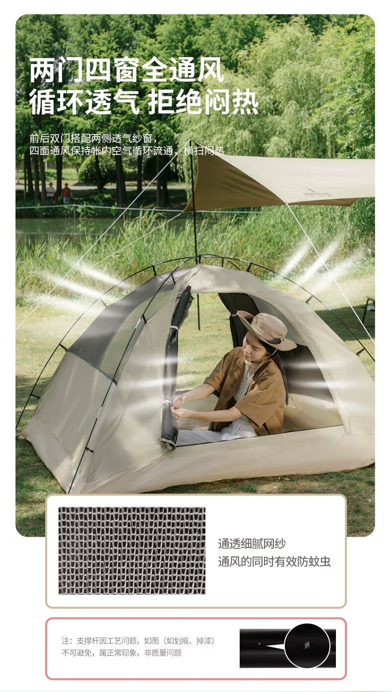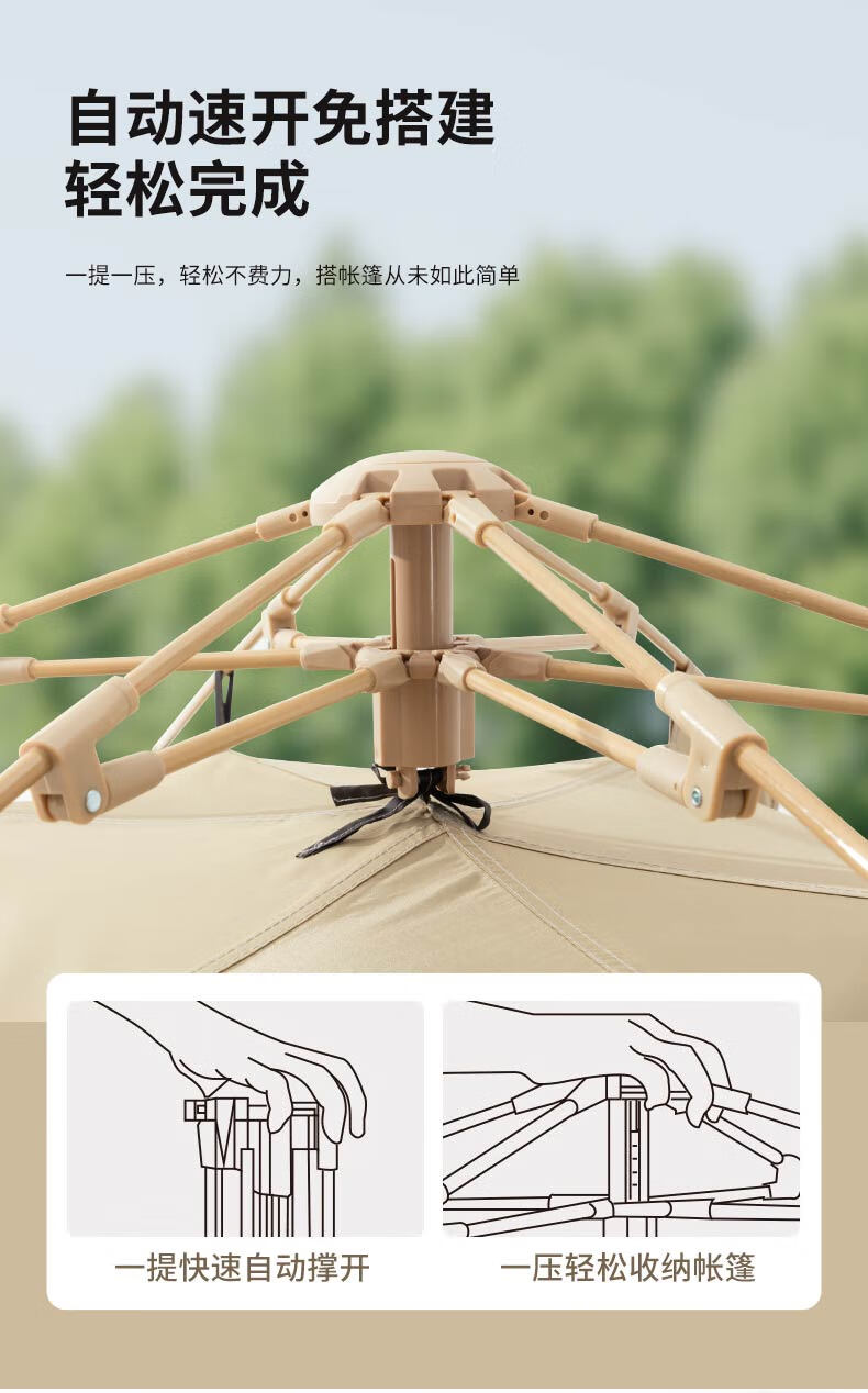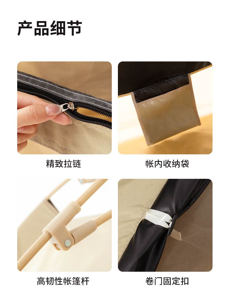 外帐面料采用210D黑胶pu布,有出色的防晒能力,防泼水、遮光、遮温、可自动速开搭建,方便使用。