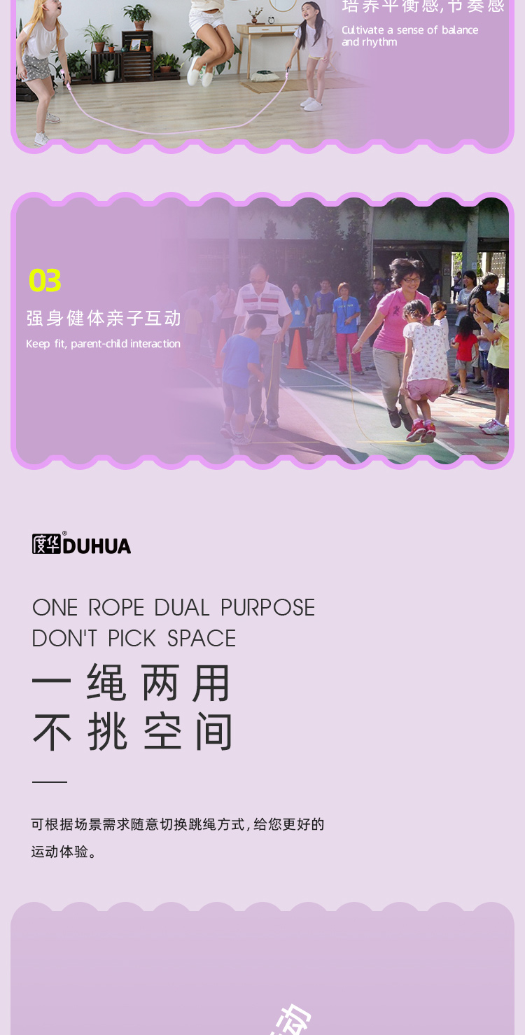 3、一对手柄两种绳行无场地束缚,室外运动选用长绳,自如跳跃,室内运动换上无绳球,可随心跳跃,环保无绳球,协调不绊脚;
