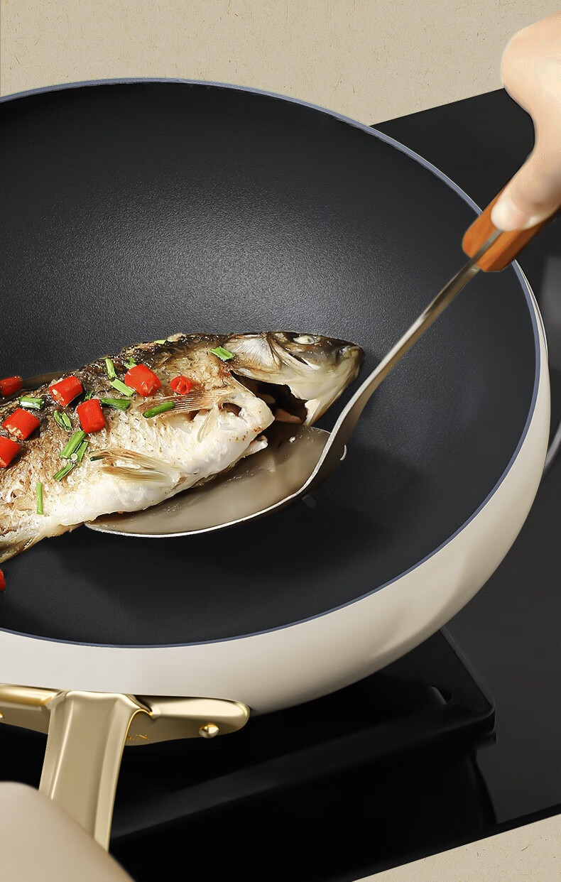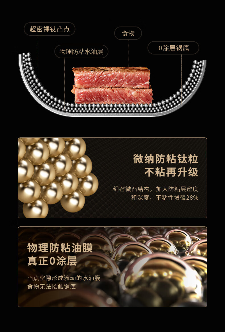 锅内表面细密微凸点阵,加大防粘密度,国标I级持久不粘。