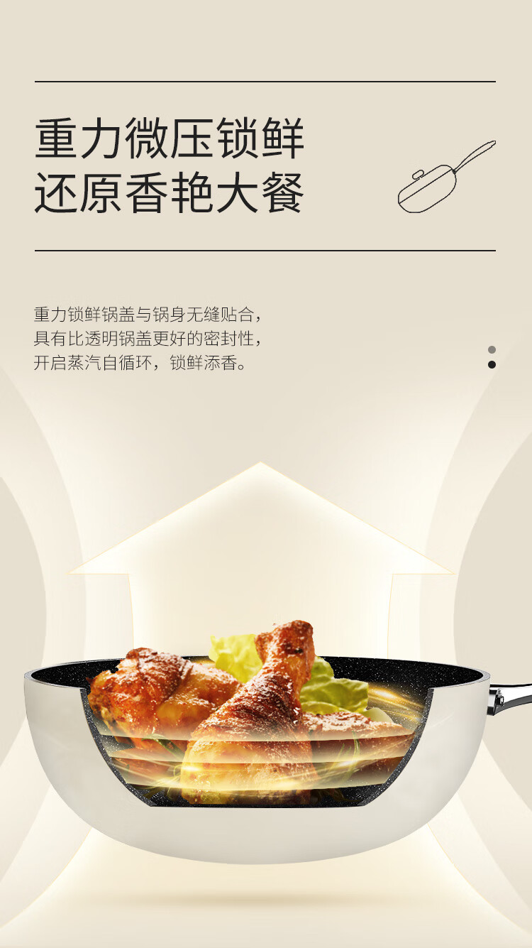 密封锅盖,精工所热,少油少烟,加深锅底不外溢。