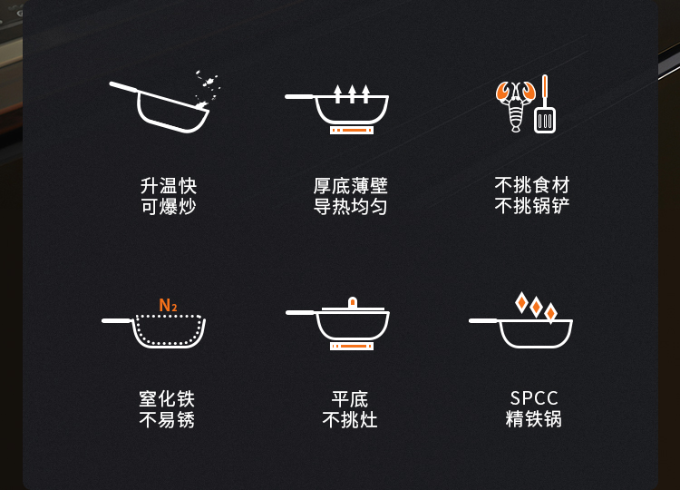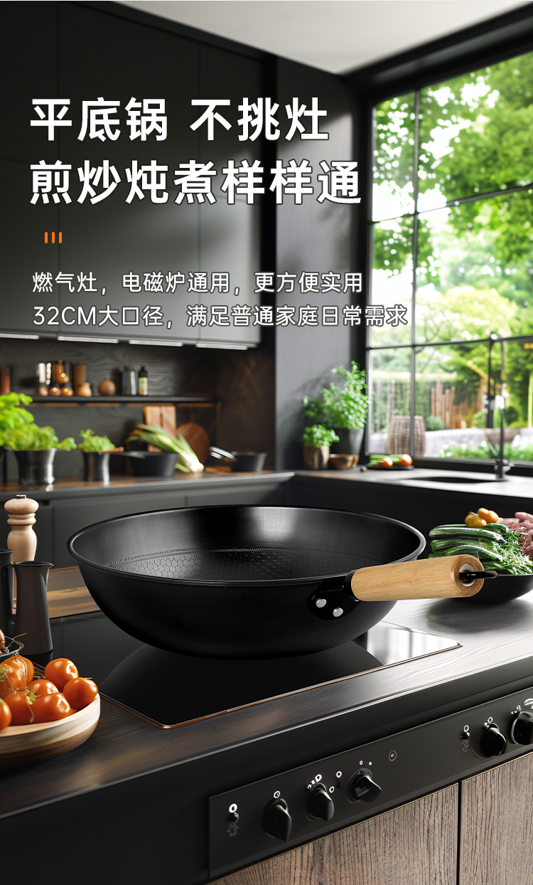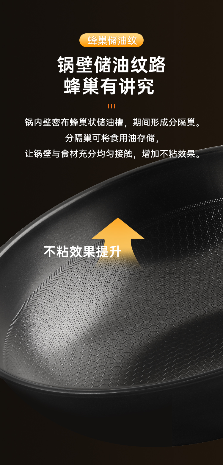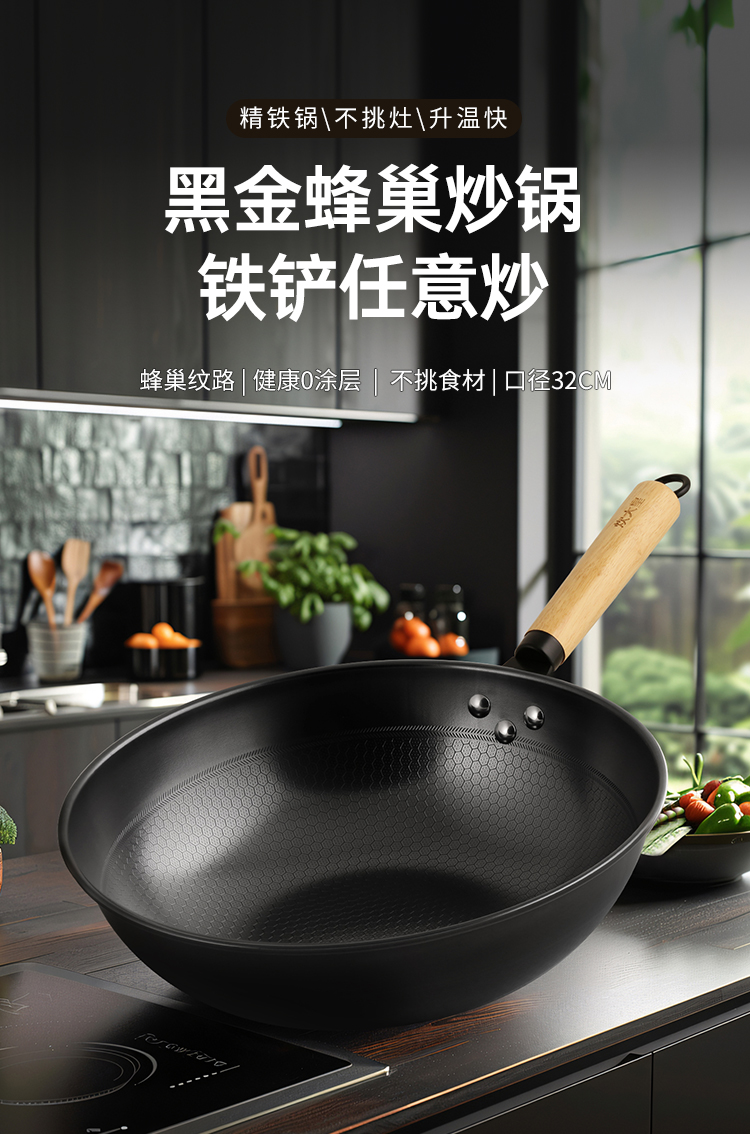 1、精铁锅\不挑灶\升温快黑金蜂巢炒锅铁铲任意炒,蜂巢纹路|健康0涂层|不挑食材。