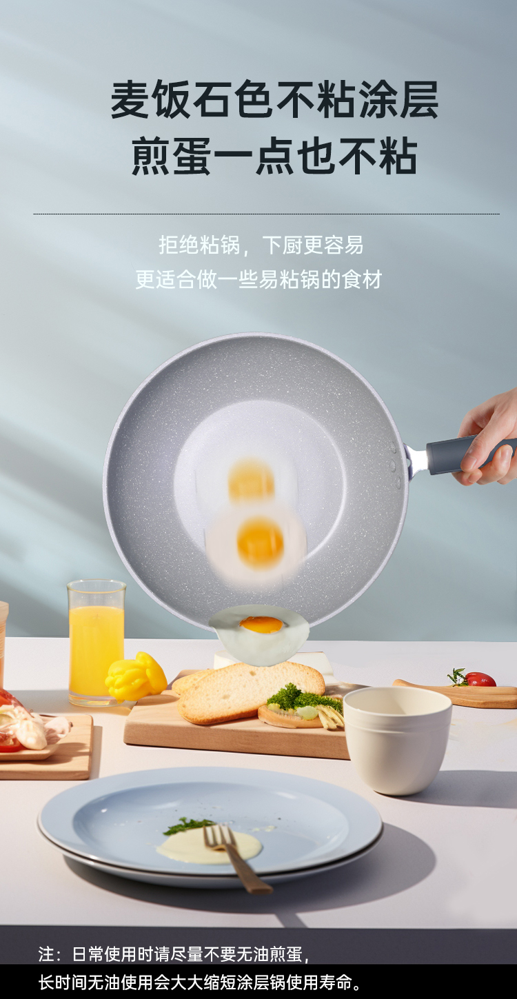 2、麦饭石色涂层不含PFOA,锅口加厚不易变形,圆弧锅身不易外洒。