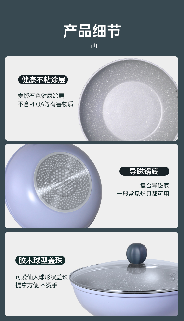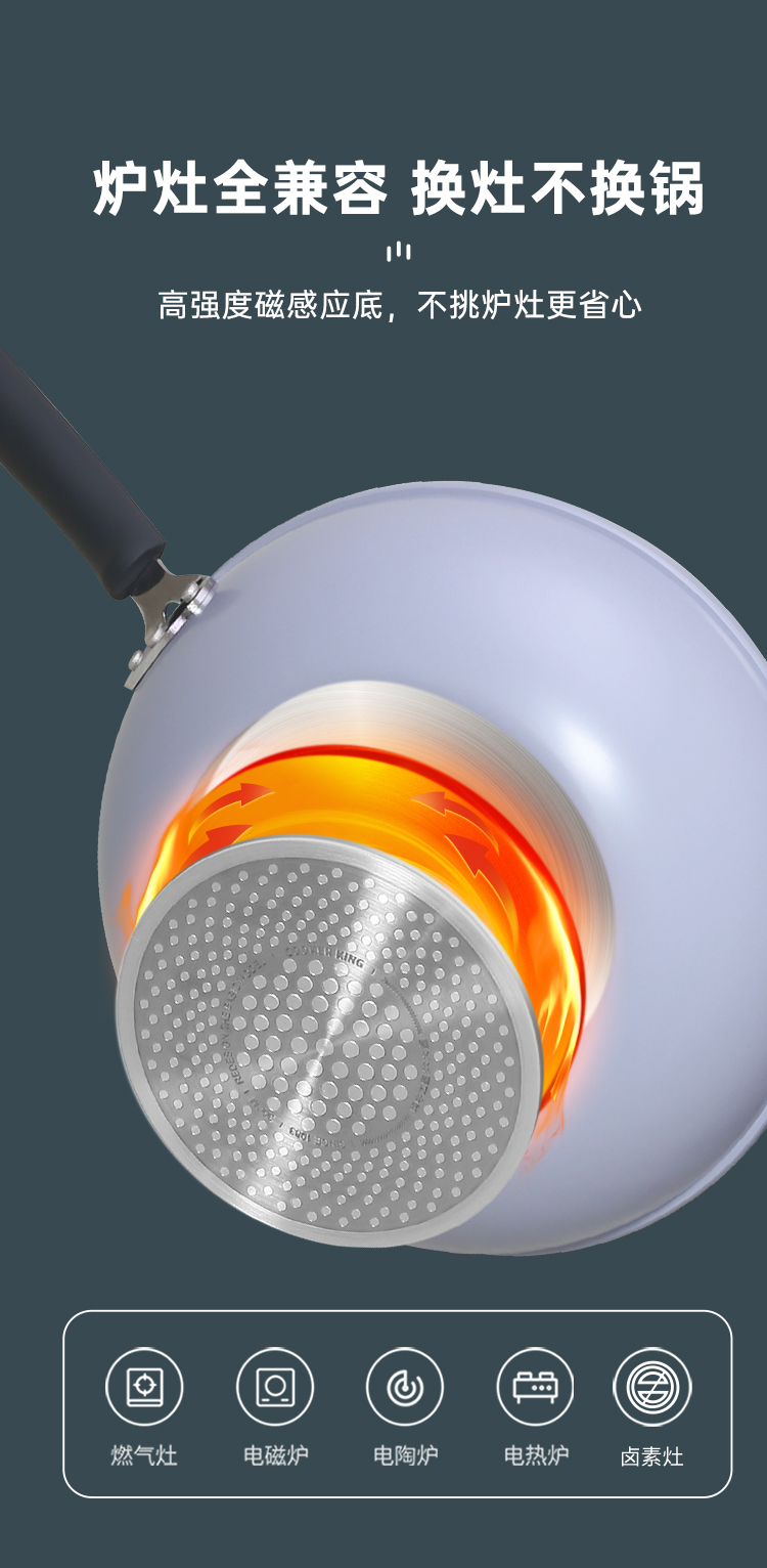3、炉灶全兼容 换灶不换锅,高强度磁感应底,不挑炉灶更省心,经久不粘清洗更容易,不粘锅好清洗,省时更省力。