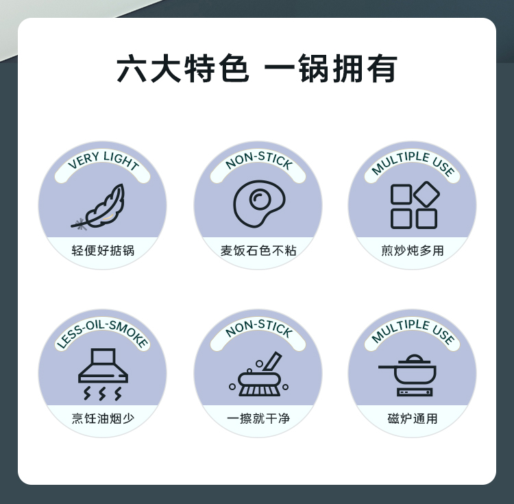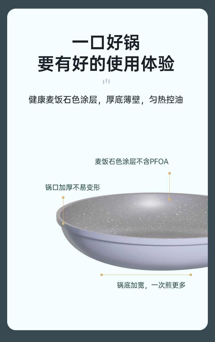 1、一口好锅要有好的使用体验,健康麦饭石色涂层,厚底薄壁,匀热控油。
