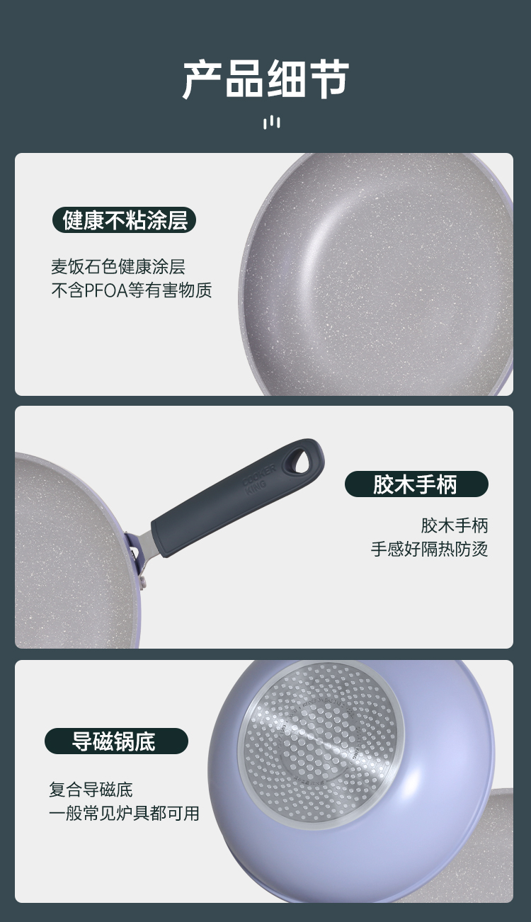 3、炉灶全兼容 换灶不换锅,高强度磁感应底,不挑炉灶更省心,经久不粘清洗更容易,不粘锅好清洗,省时更省力。