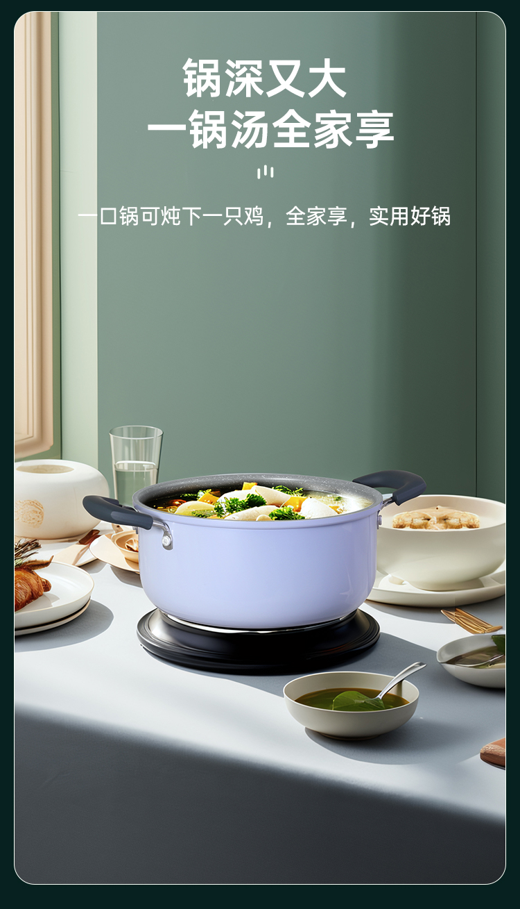 1、精致炖煮 始于颜值,浅蓝紫外观、麦饭石色涂层,健康不粘 美味加倍,一口锅可炖下一只鸡,全家享,实用好锅。