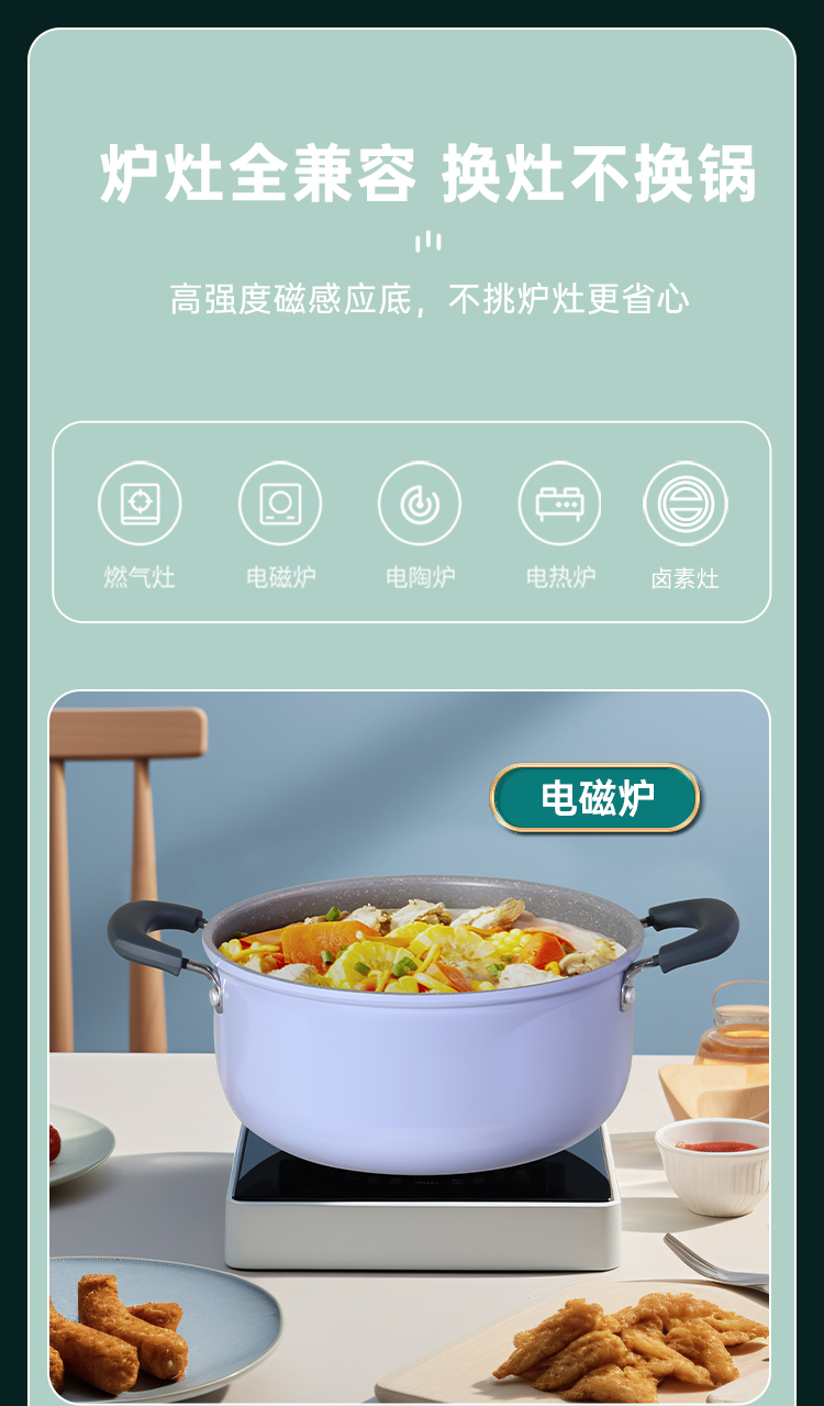 3、炉灶全兼容 换灶不换锅,高强度磁感应底,不挑炉灶更省心,经久不粘清洗更容易,不粘锅好清洗,省时更省力。