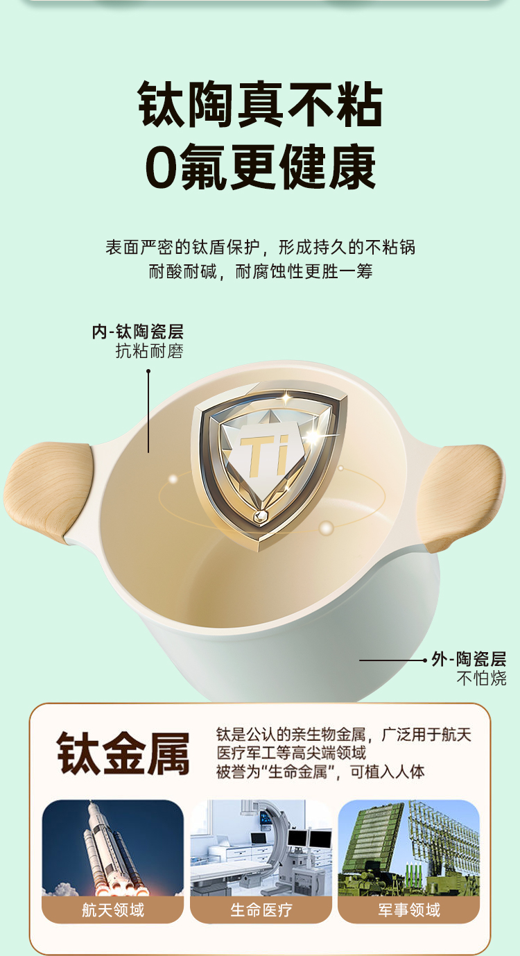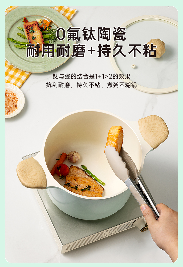 2、钛与瓷的结合是1+1>2的效果抗刮耐磨,持久不粘,煮粥不糊锅