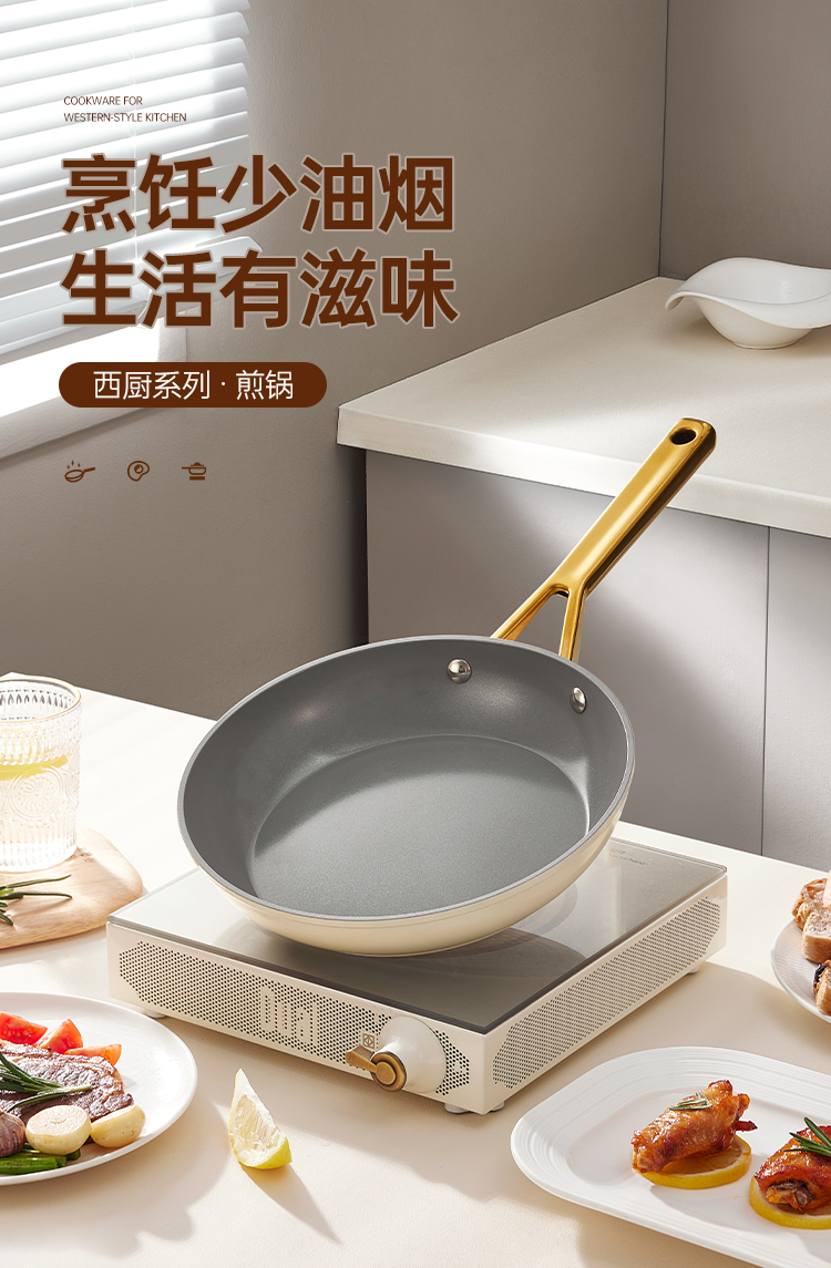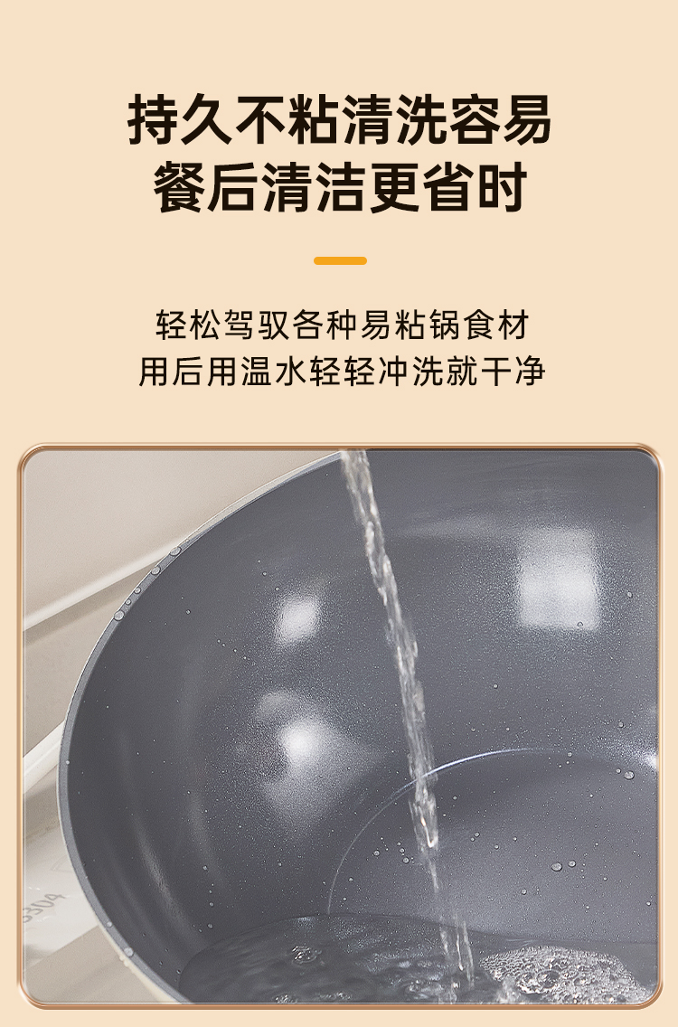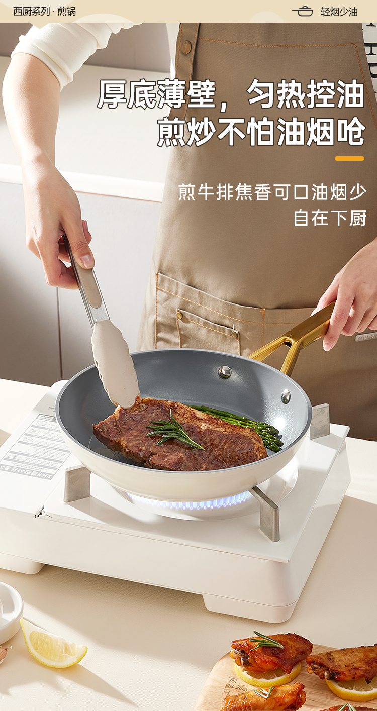 2、厚底薄壁,匀热控油,煎炒不怕油烟呛,炉灶全兼容换灶不换锅,持久不粘清洗容易餐后清洁更省时。