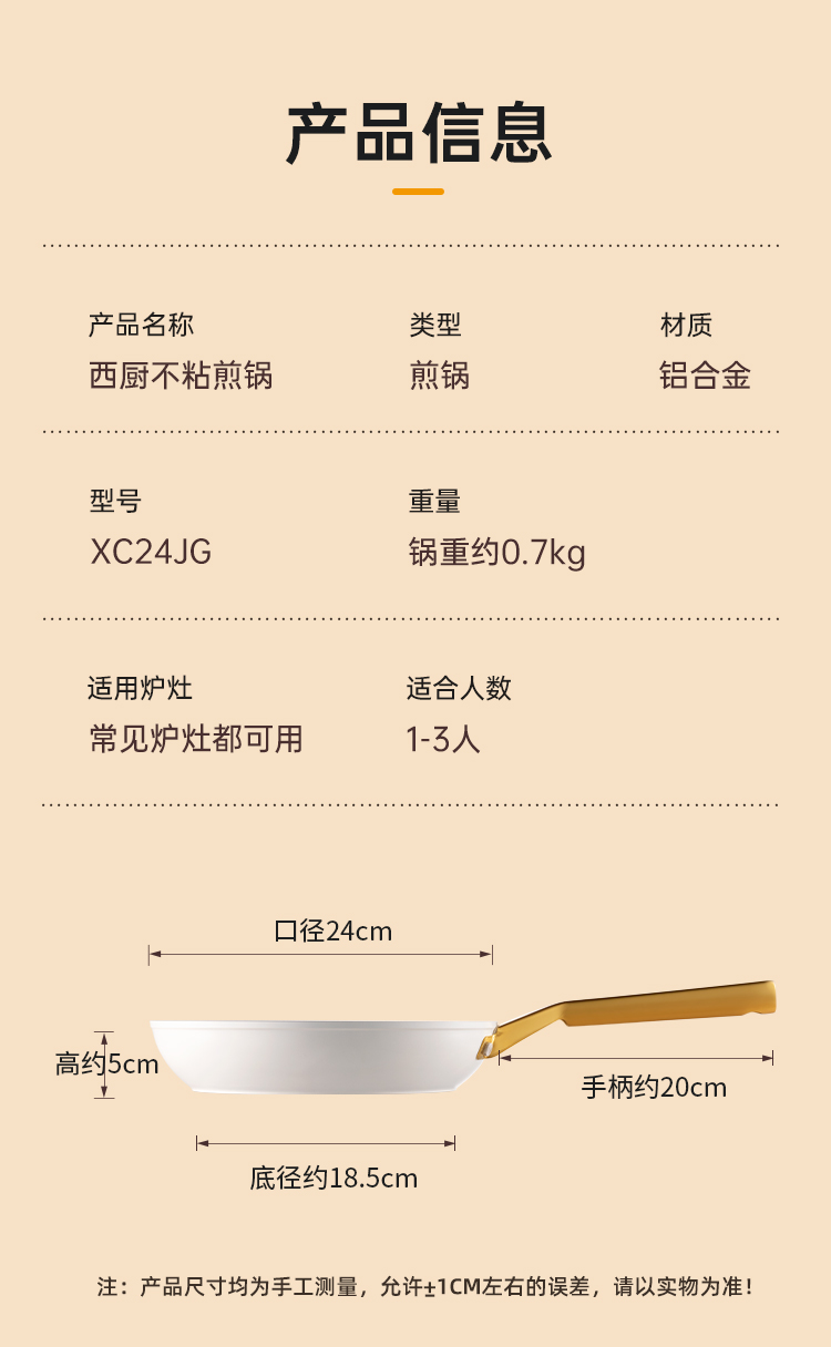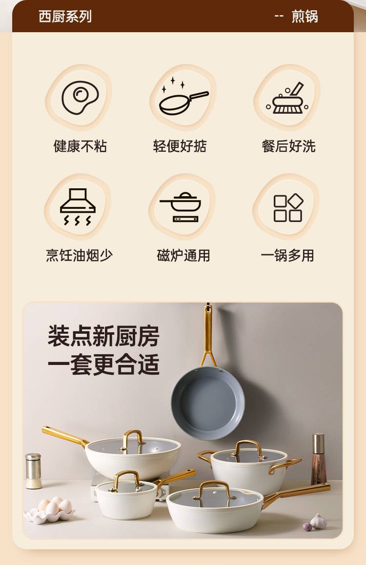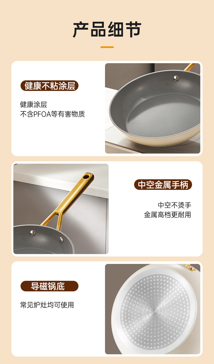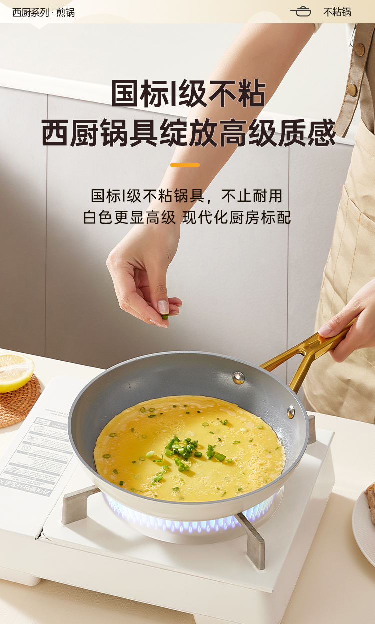 1、国标I级不粘锅具,不止耐用白色更显高级 现代化厨房标配,健康不粘涂层,煎饼煎蛋轻松拿捏轻松下厨,省时省心。