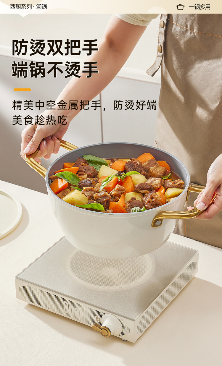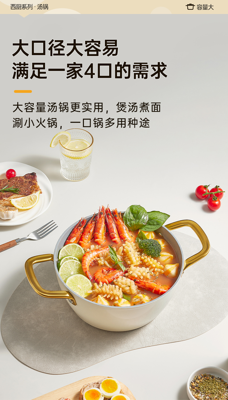 2、大容量汤锅更实用,煲汤煮面涮小火锅,一口锅多用种途,防烫双把手端锅不烫手。