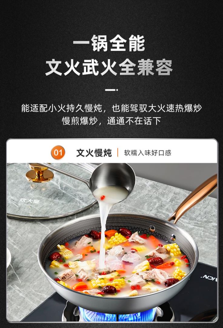 2、锅体采用304不锈钢材质健康安全,烹饪更安心,一锅全能文火武火全兼容。