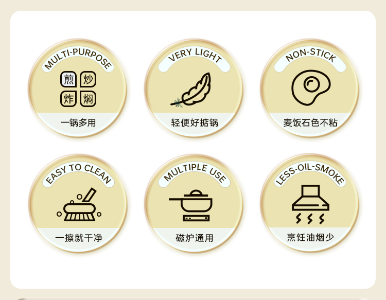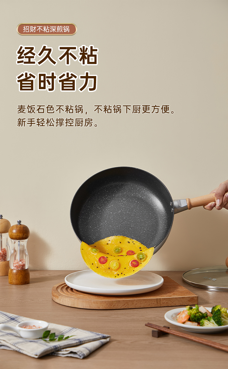 2、麦饭石色不粘锅,不粘锅下厨更方便。新手轻松撑控厨房。