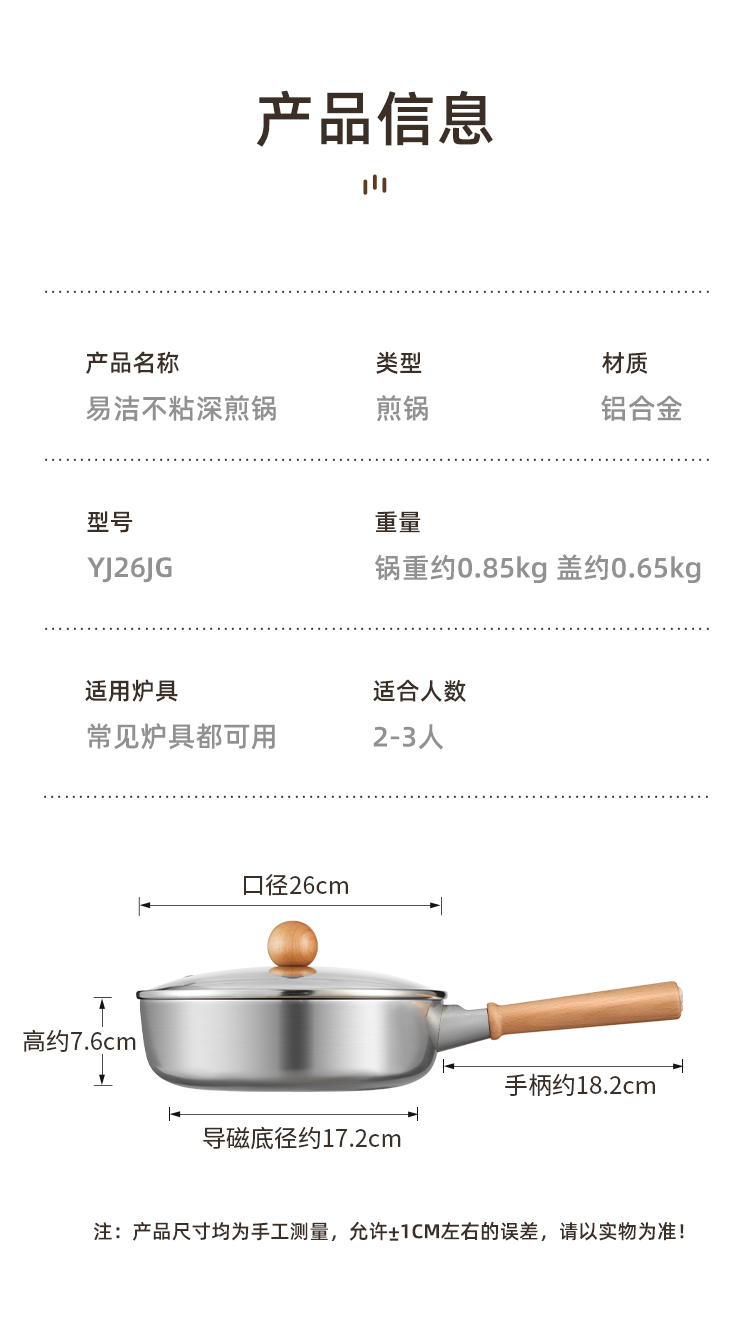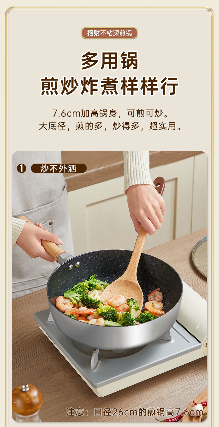 3、7.6cm加高锅身,可煎可炒大底径,煎的多,炒得多,超实用。