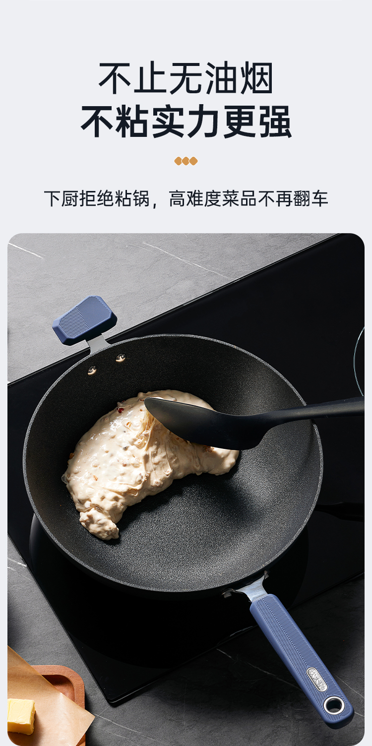 1、不止无油烟不粘实力更强涂层不粘+物理不粘下厨拒绝粘锅,高难度菜品不再翻车。