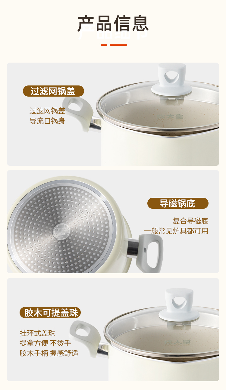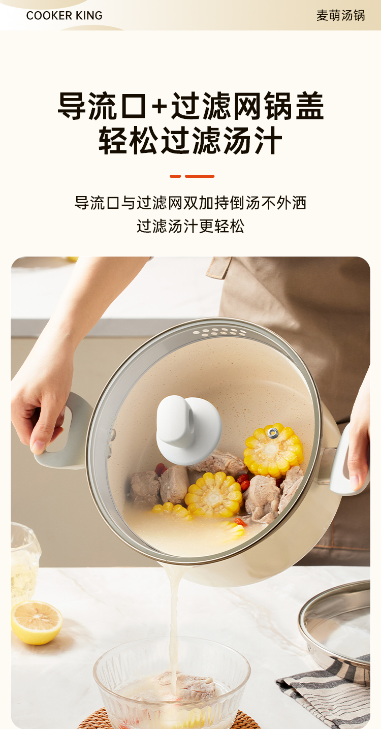 3、导流口+过滤网锅盖轻松过滤汤汁,不粘锅好清洗,省时更省力节省餐后清洗时间。