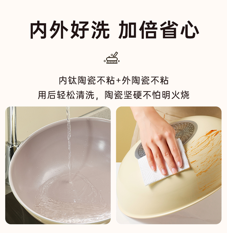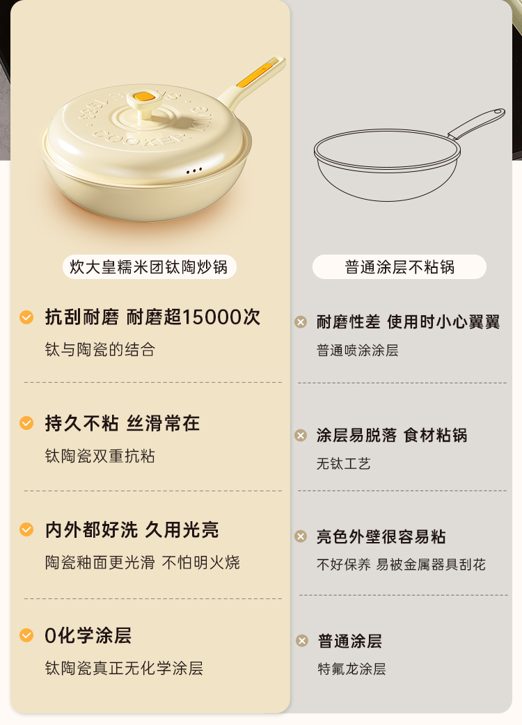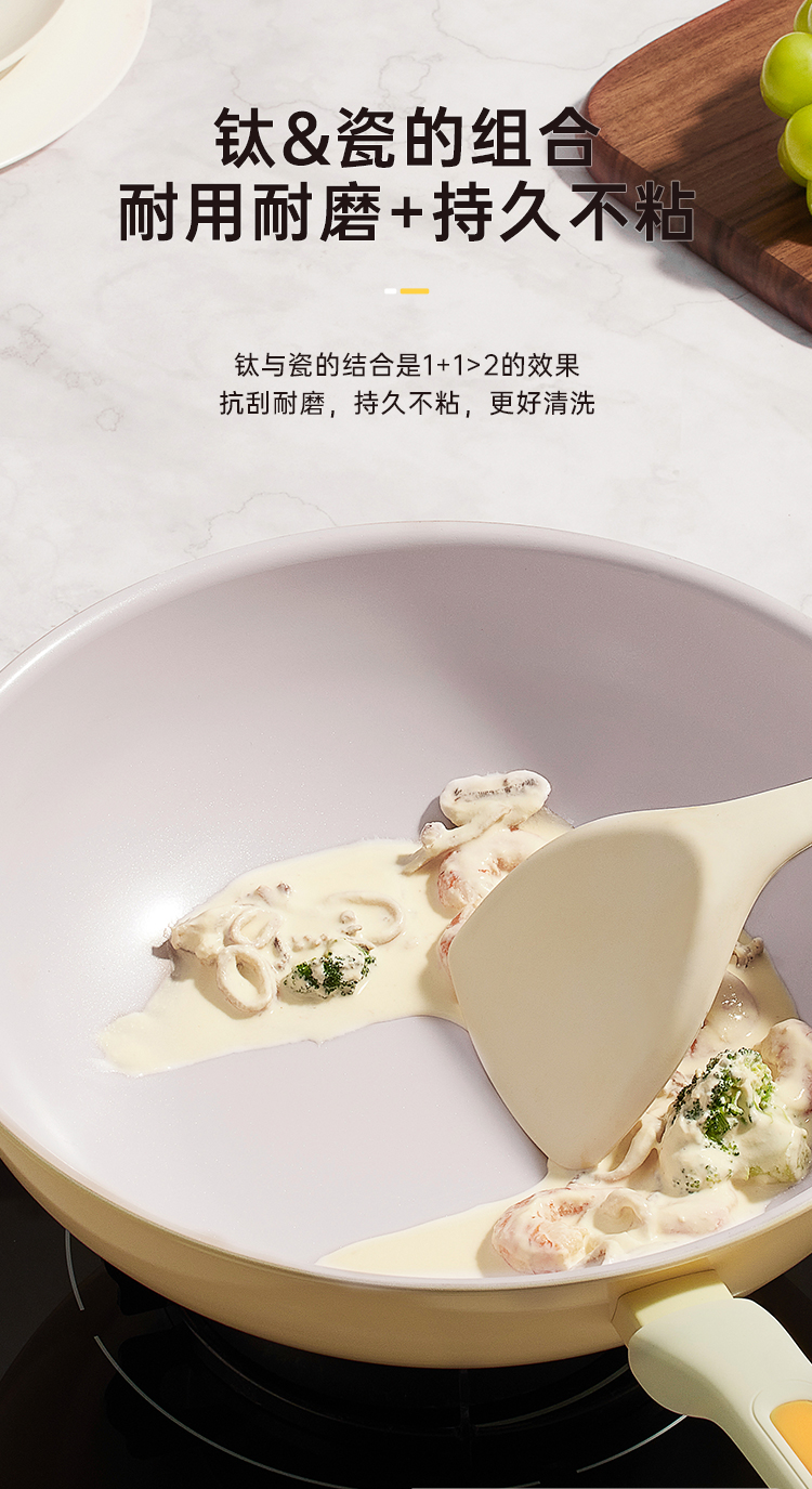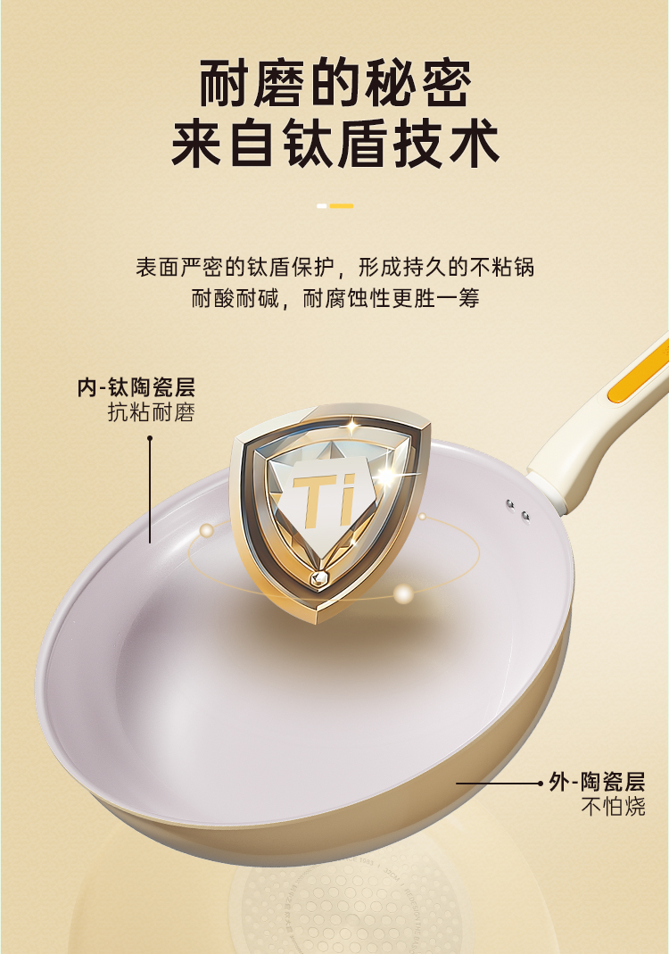 3、钛与瓷的结合是1+1>2的效果抗刮耐磨,持久不粘,更好清洗。