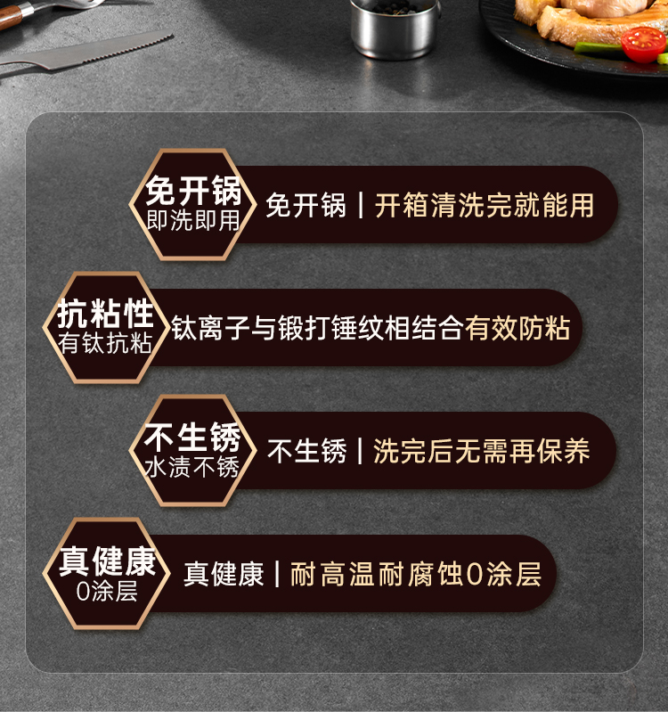 1、钛铁0涂层抗粘不锈不用养,持久抗粘无需开锅防锈耐用。
