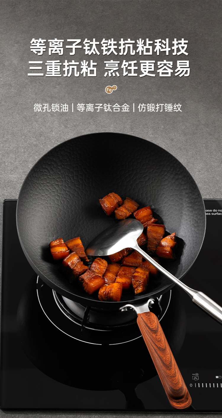 3、等离子钛铁抗粘,科技三重抗粘,烹饪更容易,中式爆炒不二选择