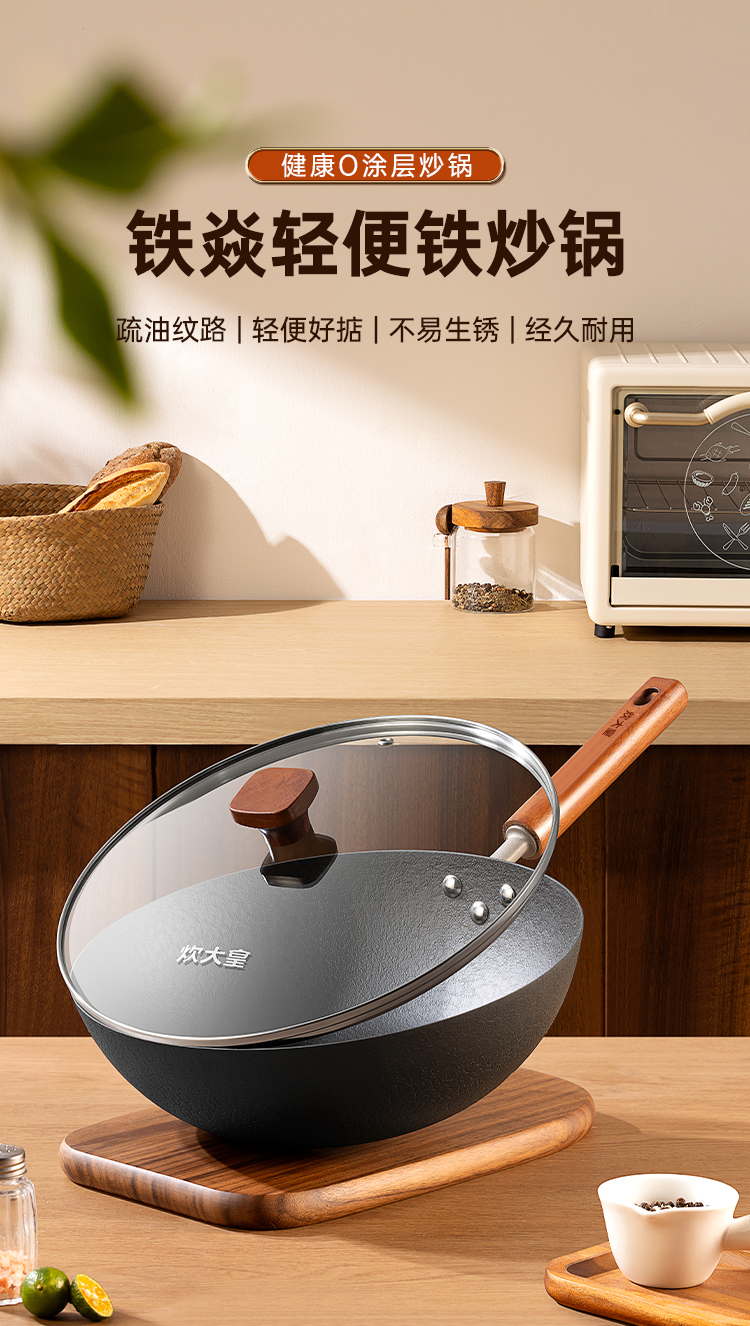 1、严选精铁真正的0涂层铁焱炒锅,疏油纹路,轻便好掂。