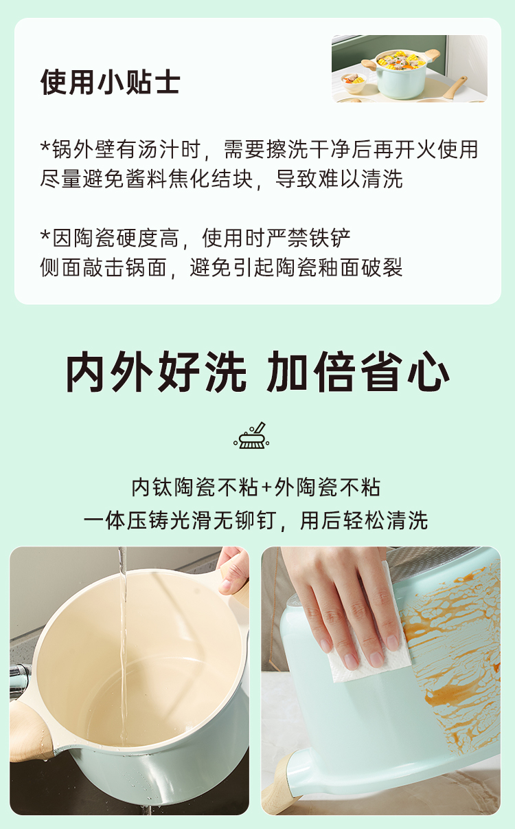 2、钛与瓷的结合是1+1>2的效果抗刮耐磨,持久不粘,煮粥不糊锅