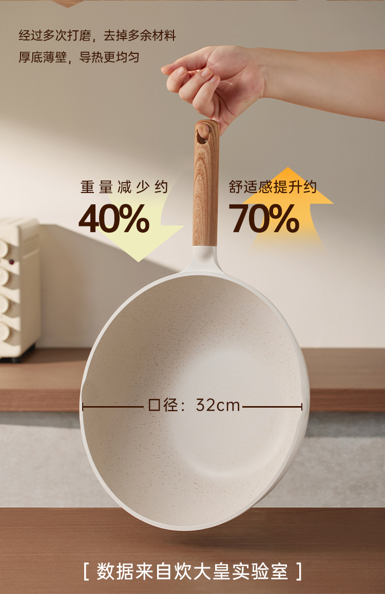 3、大容量 也轻量手感惊艳 掂勺自在,单手掂锅无负担,小指轻松勾起它。