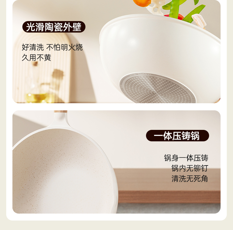2、自带双导流口左右手自由切换一体压铸锅身,自带双导流口倒汤不易外洒,左右手任意操作
