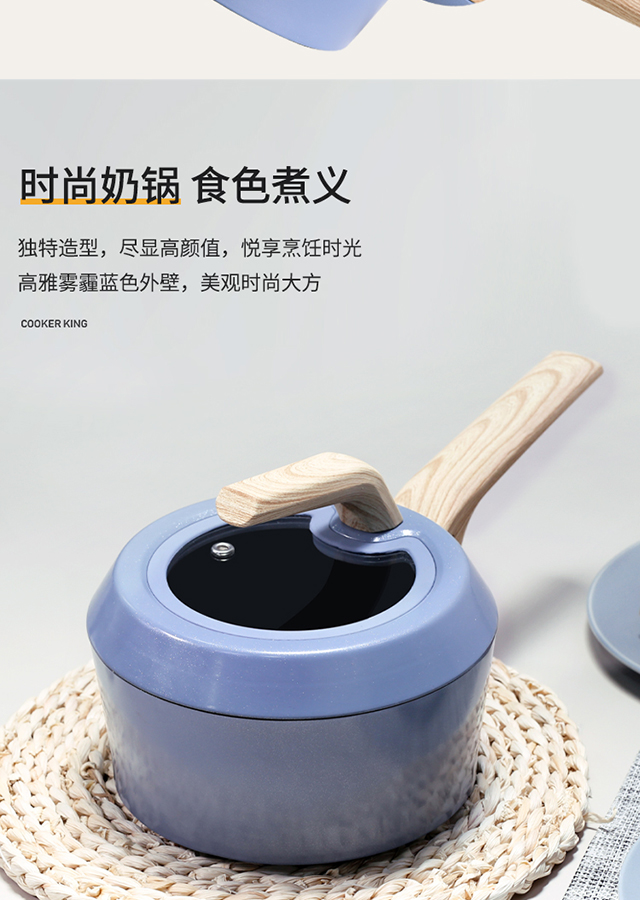 1.时尚奶锅食色煮义,独特造型,尽显高颜值,悦享烹饪时光,高雅雾霾蓝色外壁,美观时尚大方