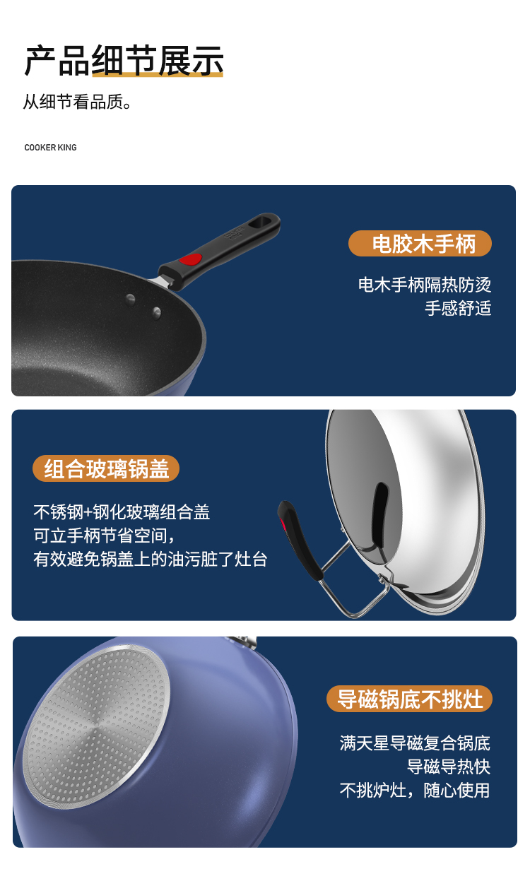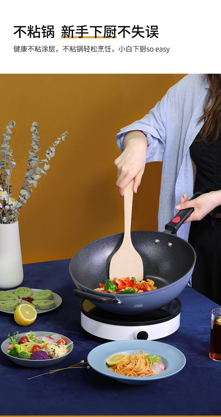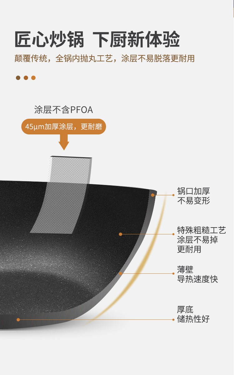 1、匠心炒锅,下厨新体验颠覆传统,全锅内抛丸工艺,涂层不易脱落更耐用。