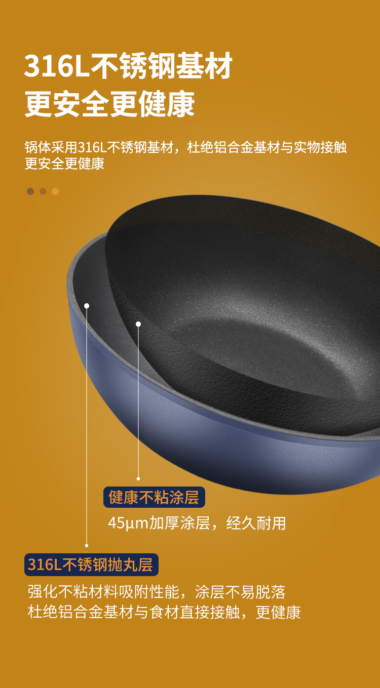 2、锅体采用316L不锈钢基材,杜绝铝合金基材与实物接触更安全更健康