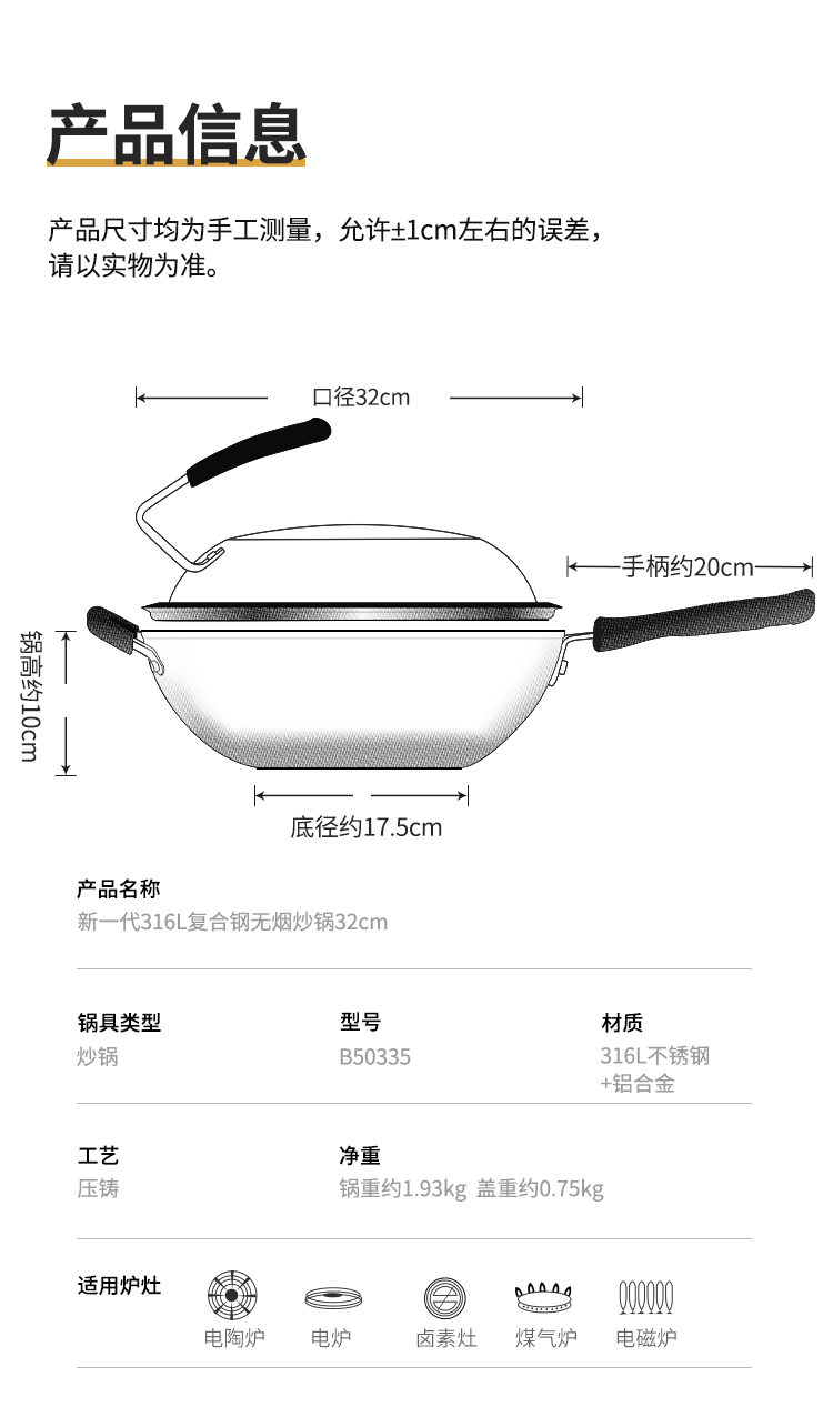 炊大皇新一代316L复合钢无烟炒锅32cmB50335