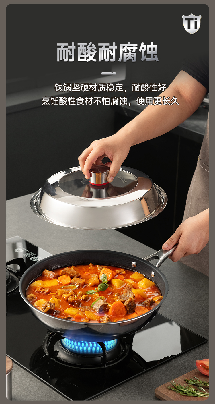 3、钛锅坚硬材质稳定,耐酸性好烹饪酸性食材不怕腐蚀,使用更长久。